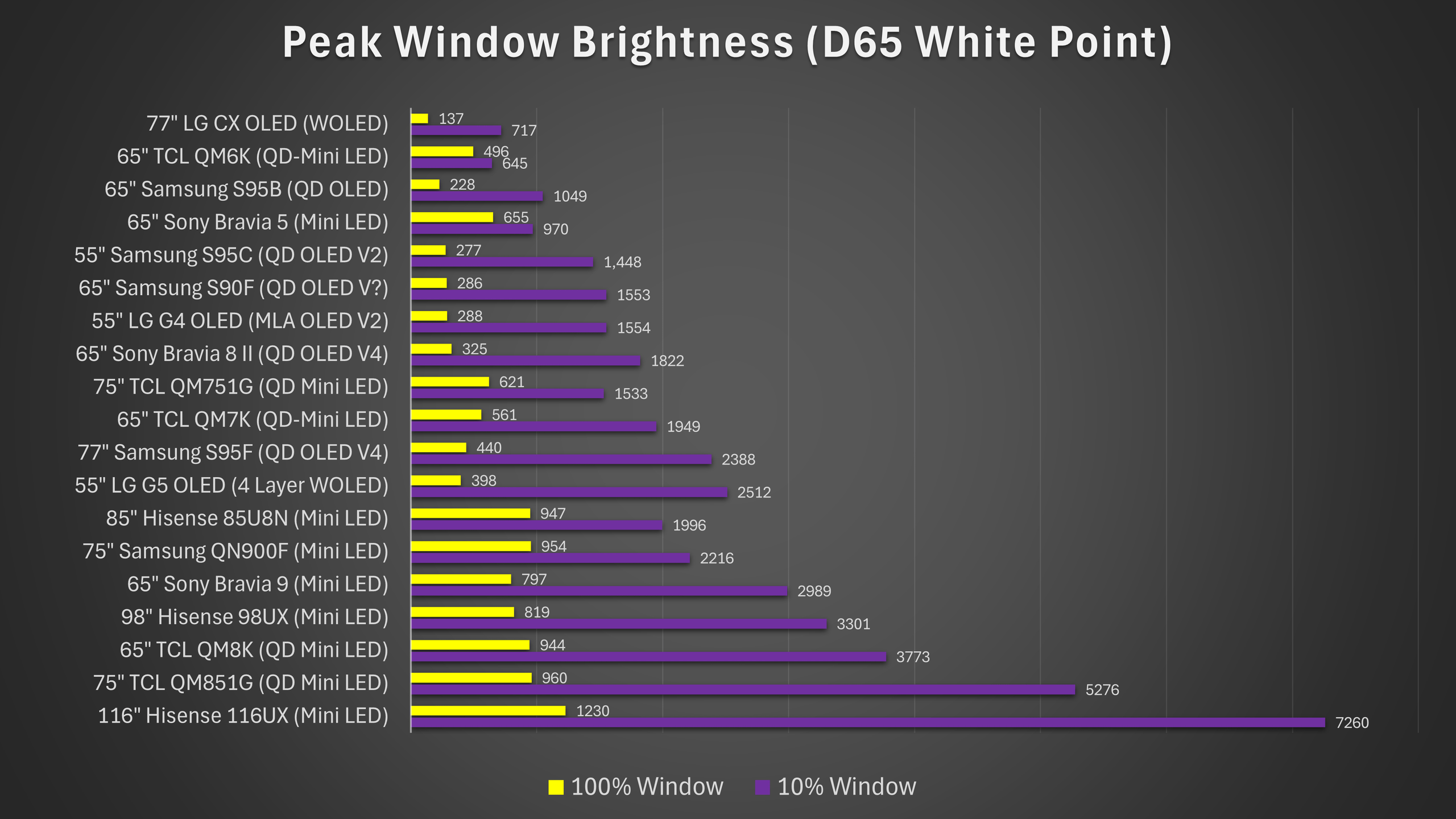 Brightness performance is nuanced here. While the Bravia 5 is a mini-LED TV that can show fairly bright full white windows, it does not produce the extreme peak brightness you might see in higher-end mini-LEDs.