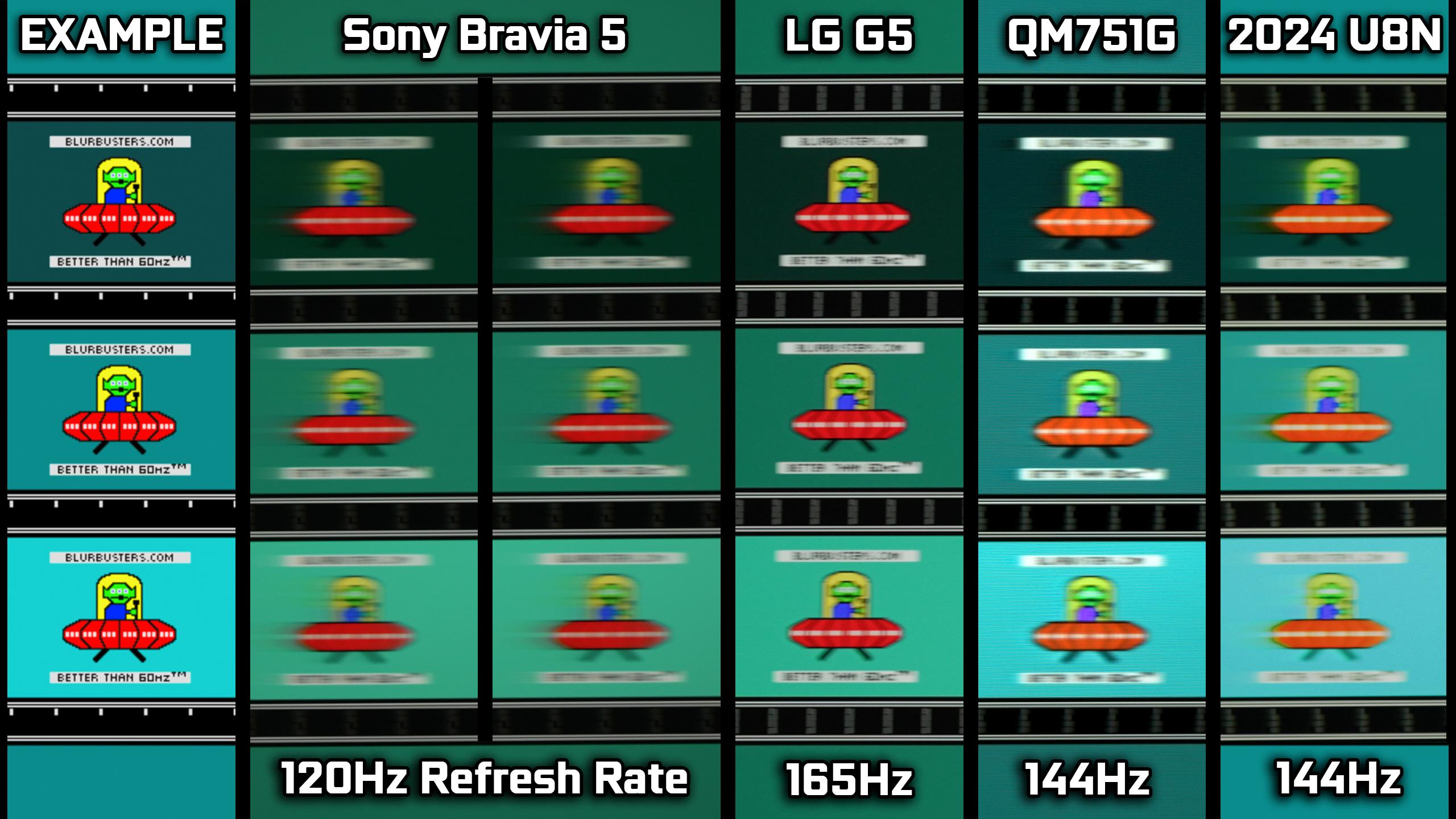 In the classic UFO motion test, the Bravia 5 shows noticeable trailing and blur compared to faster panels and competing mini-LEDs, highlighting its limits with fast-moving content.