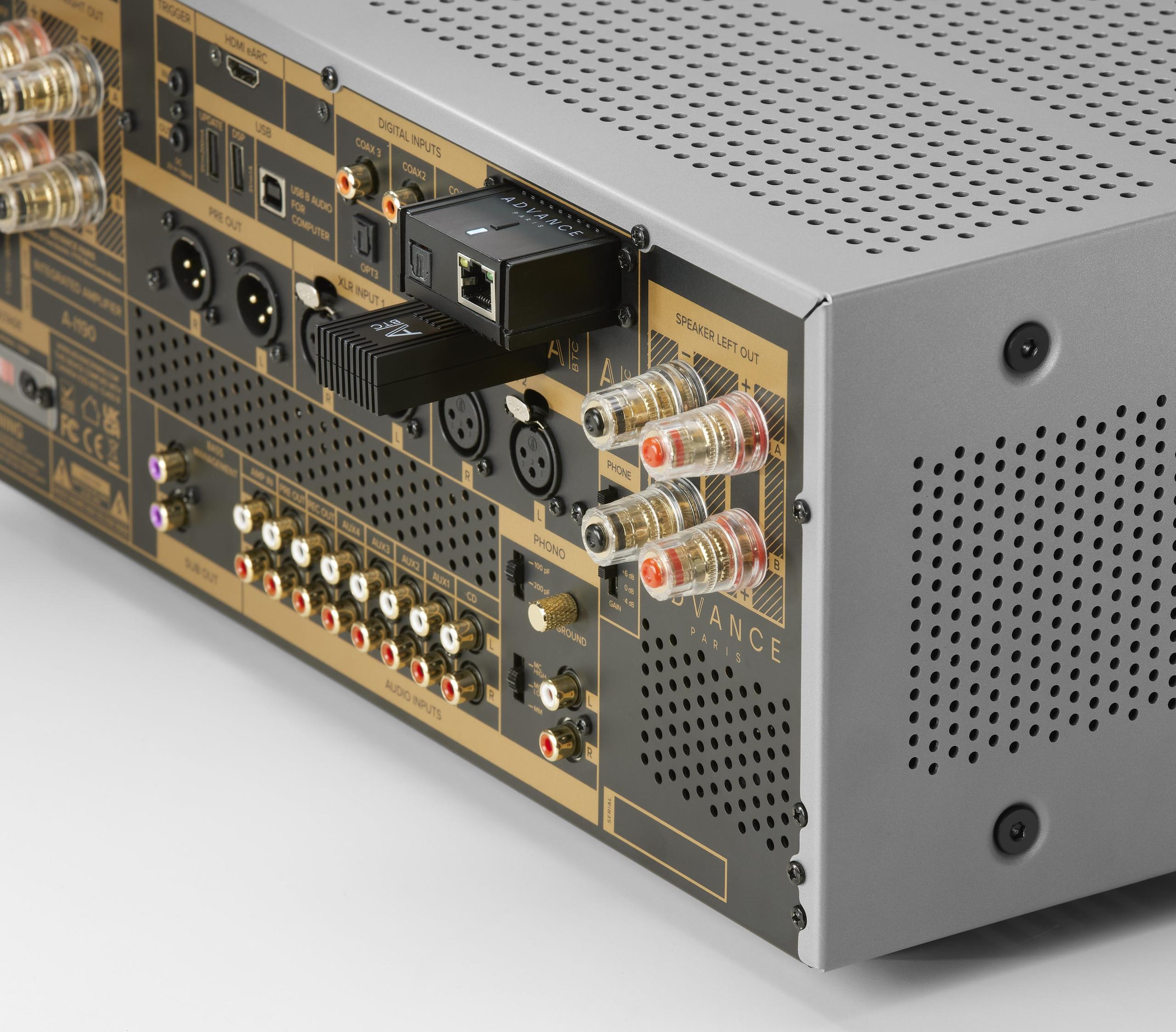Then there is the A-BTC Bluetooth 5.4 dongle, which supports bi-directional wireless audio. That means it is not just for receiving Bluetooth from a phone or tablet; it can also send audio out to a pair of wireless headphones. Advance Paris says codec support includes aptX HD, aptX Adaptive, aptX Low Latency, and AAC. For people who still watch TV through a two-channel system, the low-latency angle is the practical hook here.