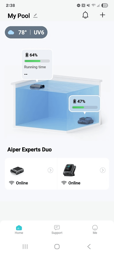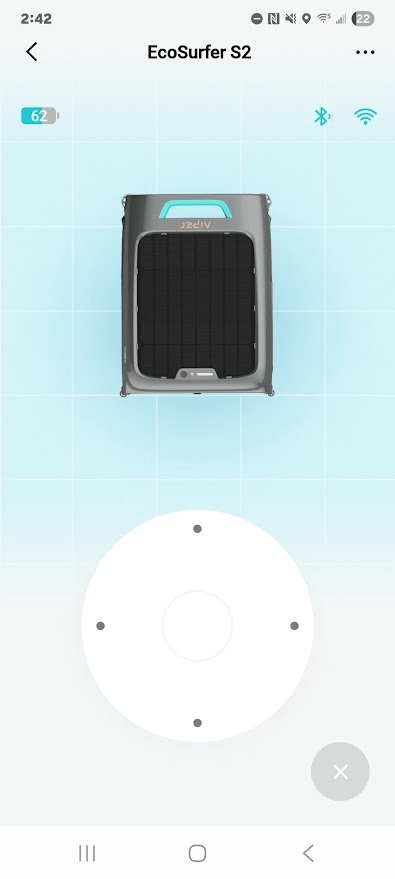 App setup was smooth. Bluetooth pairing connected quickly, and getting onto the Wi-Fi network followed easily from there. Both the V3 and the EcoSurfer S2 appear in the same Aiper app, and each one has its own controls, schedule settings, and status readout. The directional pad in the app for steering the EcoSurfer S2 is a nice touch, you can guide the skimmer to a specific corner from your phone if you want to target an area. It works well and gives you a bit of direct control when you want it.