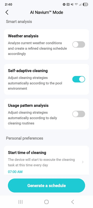 The autonomous planning mode builds a weekly cleaning schedule based on your pool's dimensions, weather conditions, and past cleaning history, then decides when and how to run for the best results. Once it has learned your pool, it adjusts on its own, running more during good conditions, pacing itself during others. The goal is a week of clean pool with as little input from you as possible.