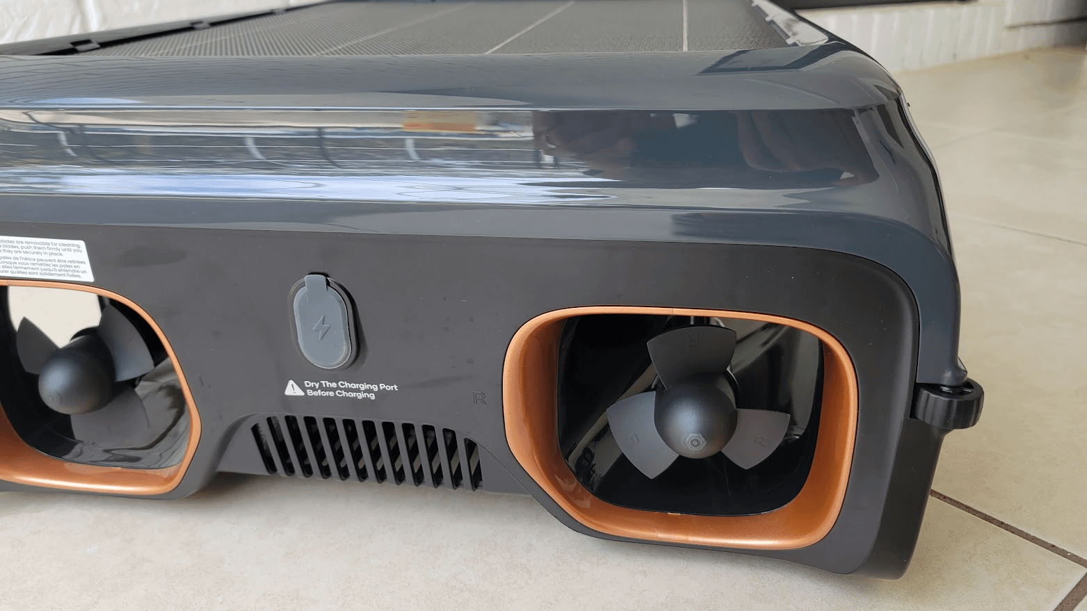 There are brushes at both ends of the unit, and this is where I first noticed a difference from the older Scuba S1. The rubber cleaning flaps extend slightly farther out than the previous generation. In practice it means the brushes are making better contact with the pool walls, particularly at the waterline where pollen, body oils, and the usual sunscreen ring tend to accumulate. This combines with side-mounted nozzles that deliver a horizontal jet of water along the waterline, scrubbing off that buildup as part of the regular cleaning cycle.