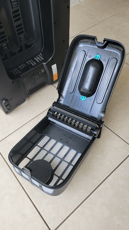 The front of the unit has a wide-mouth intake where everything gets pulled in. The rear has two propellers. Underneath, four fold-out legs act as stabilizers that prevent the unit from getting stuck on pool steps or a shallow tanning ledge. The debris basket is accessed through a front side-mounted drawer, which is a better design than the top-access baskets you find on other skimmers. Top-access means pulling a wet basket straight up through the water, which usually results in a splash of murky pool water somewhere you didn't want it. I quickly learned how to pull it out without spilling debris back in the pool, helped by an automatic internal flap.
