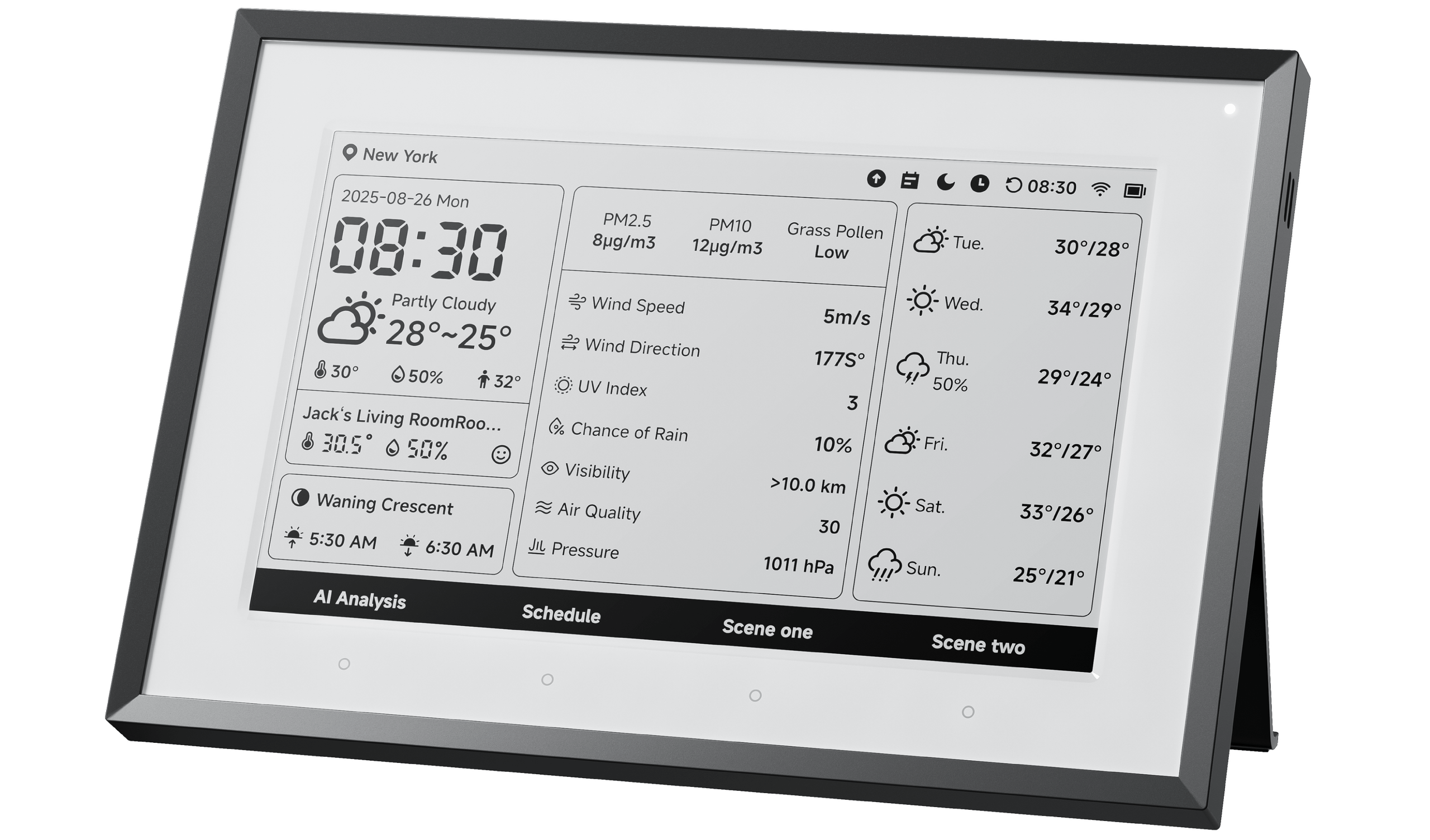 First is the SwitchBot Weather Station, which uses a 7.5-inch E-Ink screen to display indoor/outdoor conditions, upcoming forecasts, air quality, and even your synced calendar. You also get AI-generated weather summaries with personalized tips and a short quote of the day. It’s a simple way to get key info at a glance, without reaching for your phone.
