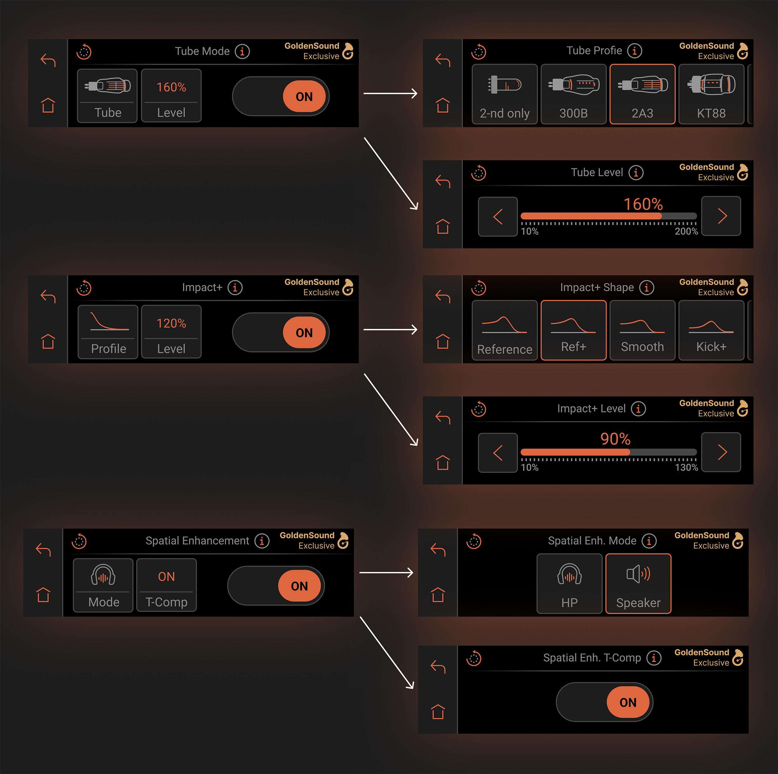 In the earlier version, Impact+ applied a fixed tuning designed to make bass sound fuller and more realistic. Gen 2 expands that into seven selectable profiles: Reference, Ref+, Smooth, Kick+, DD-Comp, DD-Comp+, and Sub-Bass. Each one changes the low-end balance and dynamic character in a different way, which means you can adjust the result depending on whether your headphones sound lean, your speakers need a little more weight, or you simply want a different presentation for certain recordings.