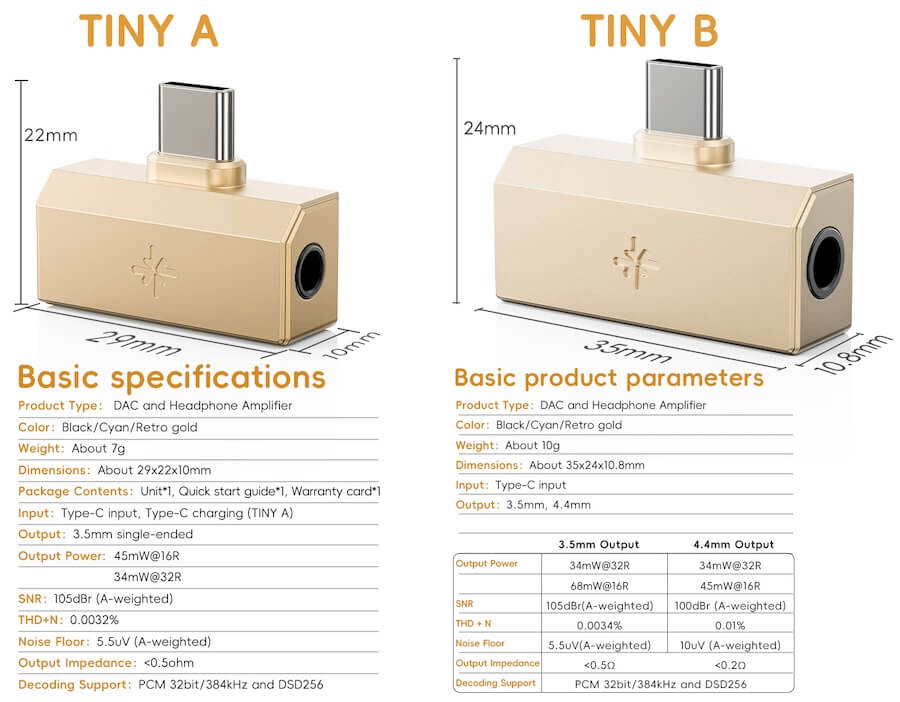 Output power won’t blow away any desktop amps, but it’s solid for what it is. The TINY A puts out up to 45mW, while the TINY B gives you 68mW through its 3.5 mm output and 45mW through the 4.4 mm jack. That’s plenty for everyday headphones and most in-ear monitors.