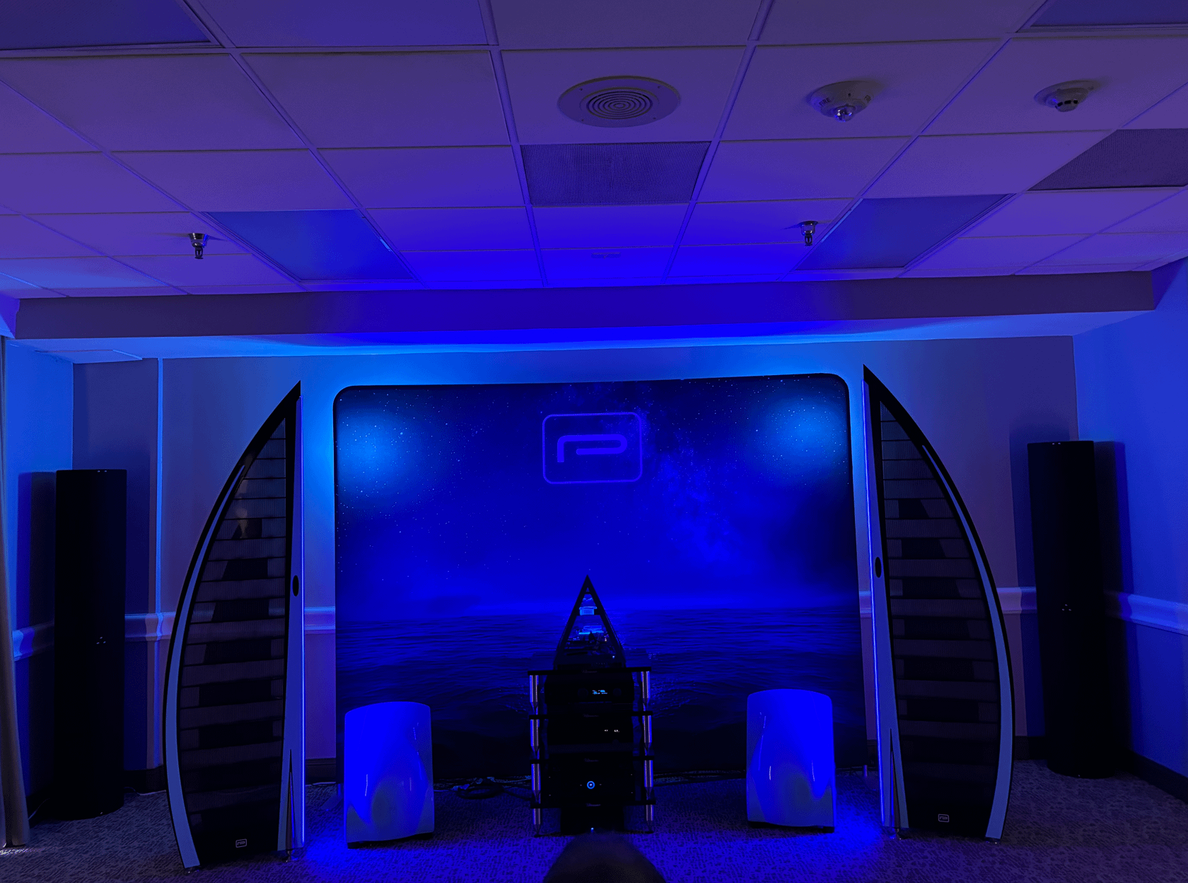 My third-place pick goes to Popori Acoustics HYPERSAIL. Normally, I’m skeptical of speakers that lean heavily into extreme or unconventional design, but this room won me over almost immediately. From the moment I sat down, the sound was engaging, open, and surprisingly cohesive. The large, sail-like line-array design wasn’t just for show — it delivered scale and presence without sounding disjointed or overwhelming. This was one of those rooms that quietly impressed rather than shouting for attention.