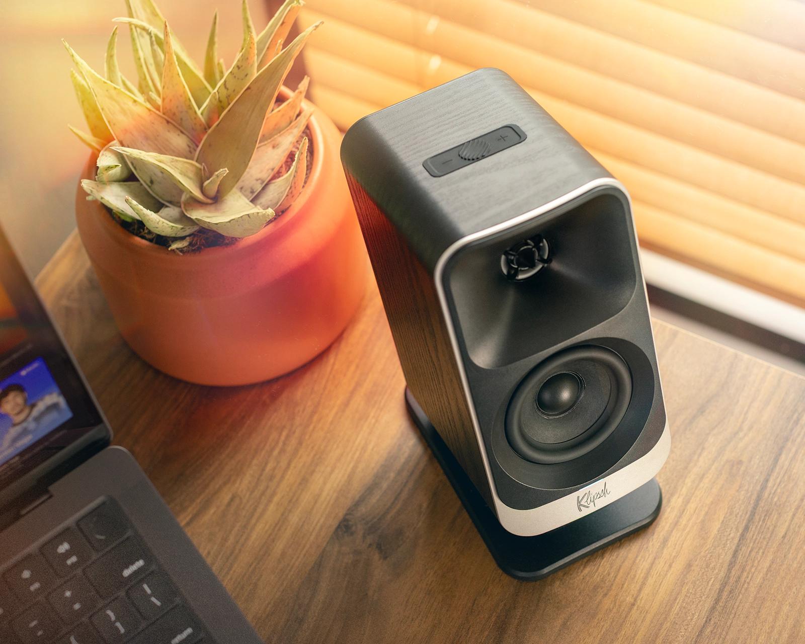 Klipsch has cleaned things up significantly compared to the older ProMedia line. The satellites are noticeably smaller and more refined — they'll sit neatly on either side of a monitor without dominating the desk or looking like they belong in a LAN cafe from 2008. The angled driver positioning is a practical choice that pays off in actual use: aimed slightly upward toward your ears, the imaging stays focused and the sound doesn't feel like it's hitting the underside of your chin.