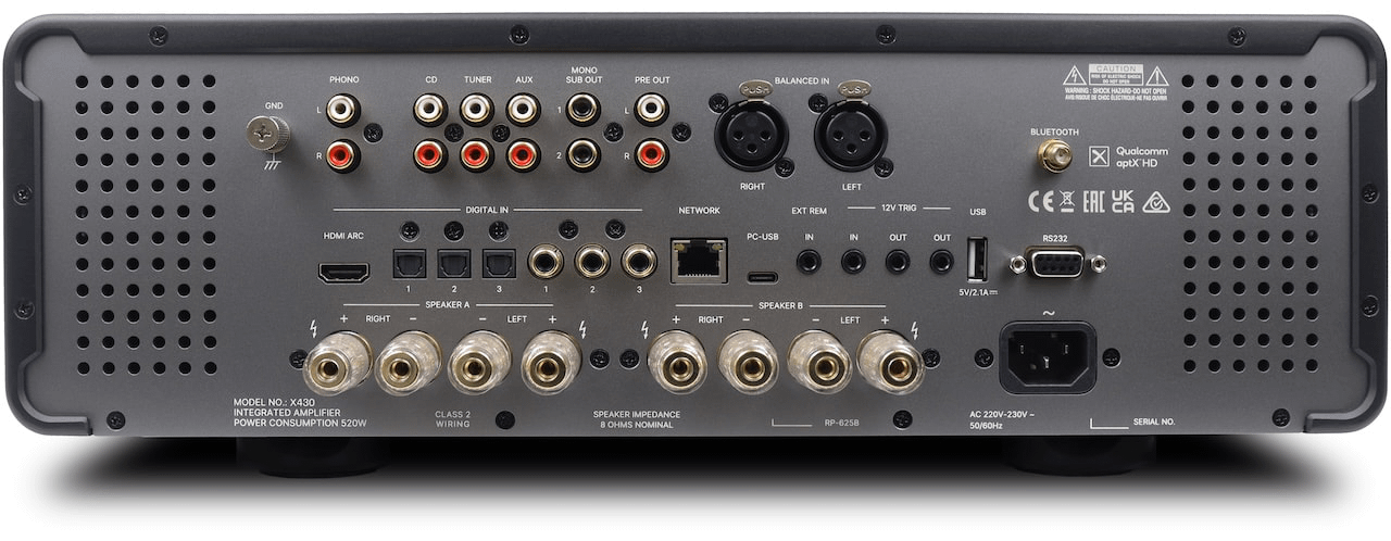 That mix matters because it makes the X430 more than just a traditional hi-fi amp. HDMI ARC means it can pull double duty in a living room system, handling TV sound without requiring an AV receiver. The phono input gives vinyl listeners an easy starting point, and the USB-C input opens the door to high-resolution playback from a laptop or desktop source.