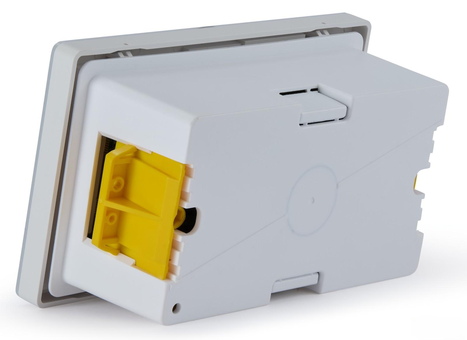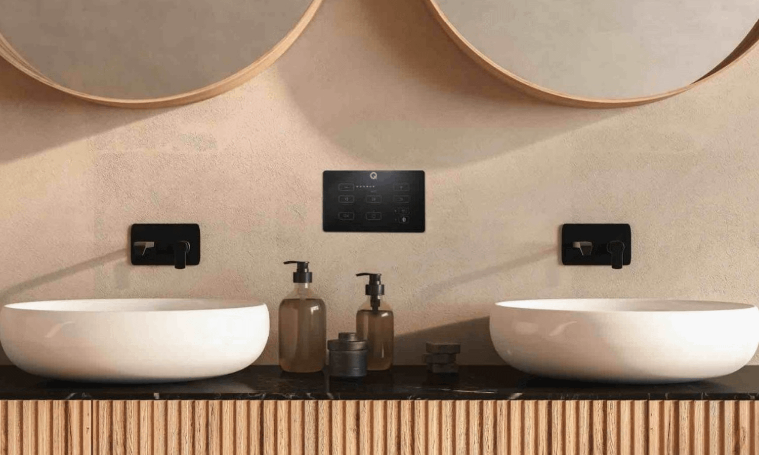 The E60 comes in deep black or warm white finishes to blend into modern rooms. The wall panel uses LED indicators for feedback, but they’re meant to stay low-key: the lights brighten while you’re adjusting settings and dim automatically in low light so you’re not stuck with an always-on glow at night.