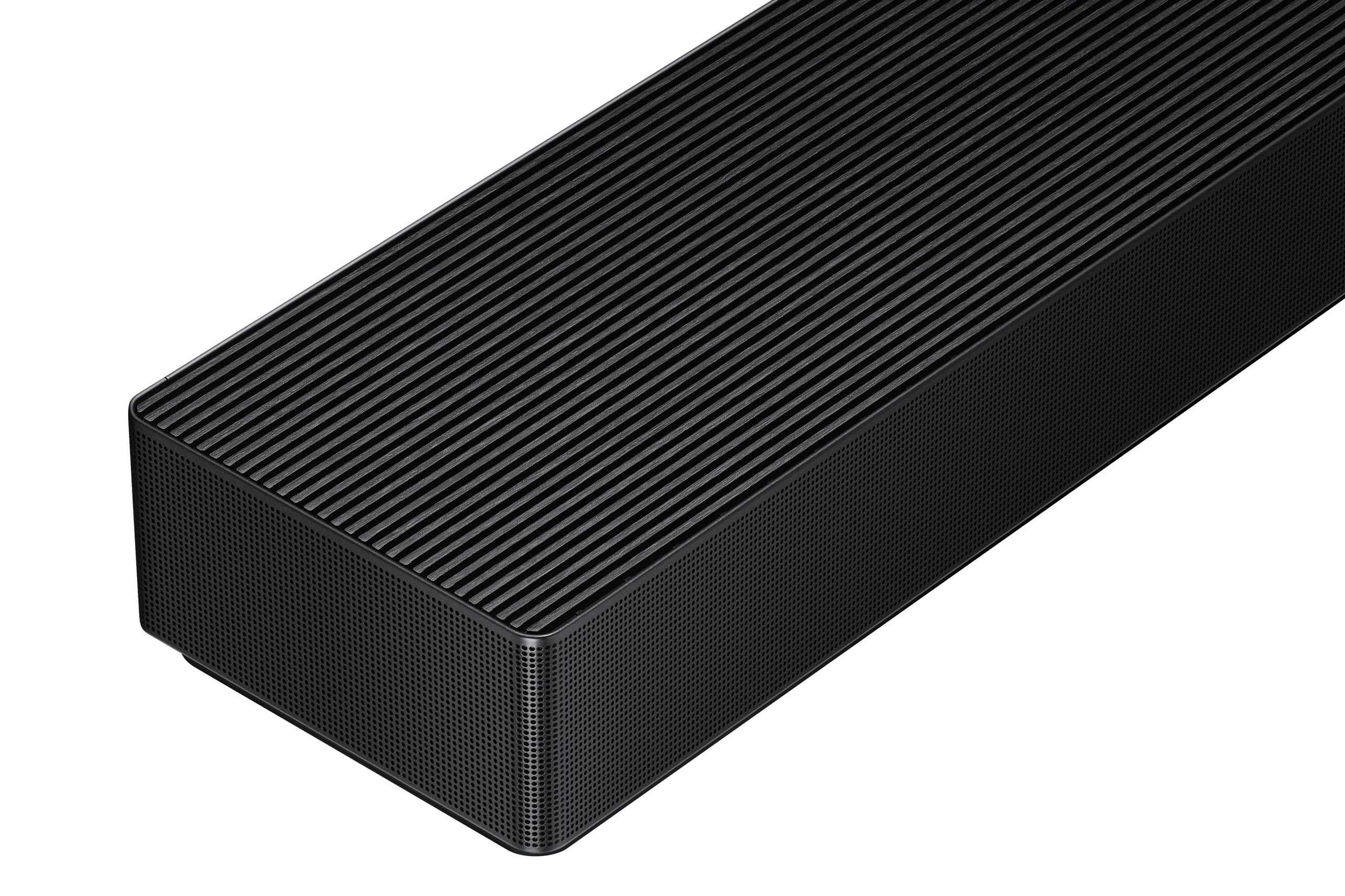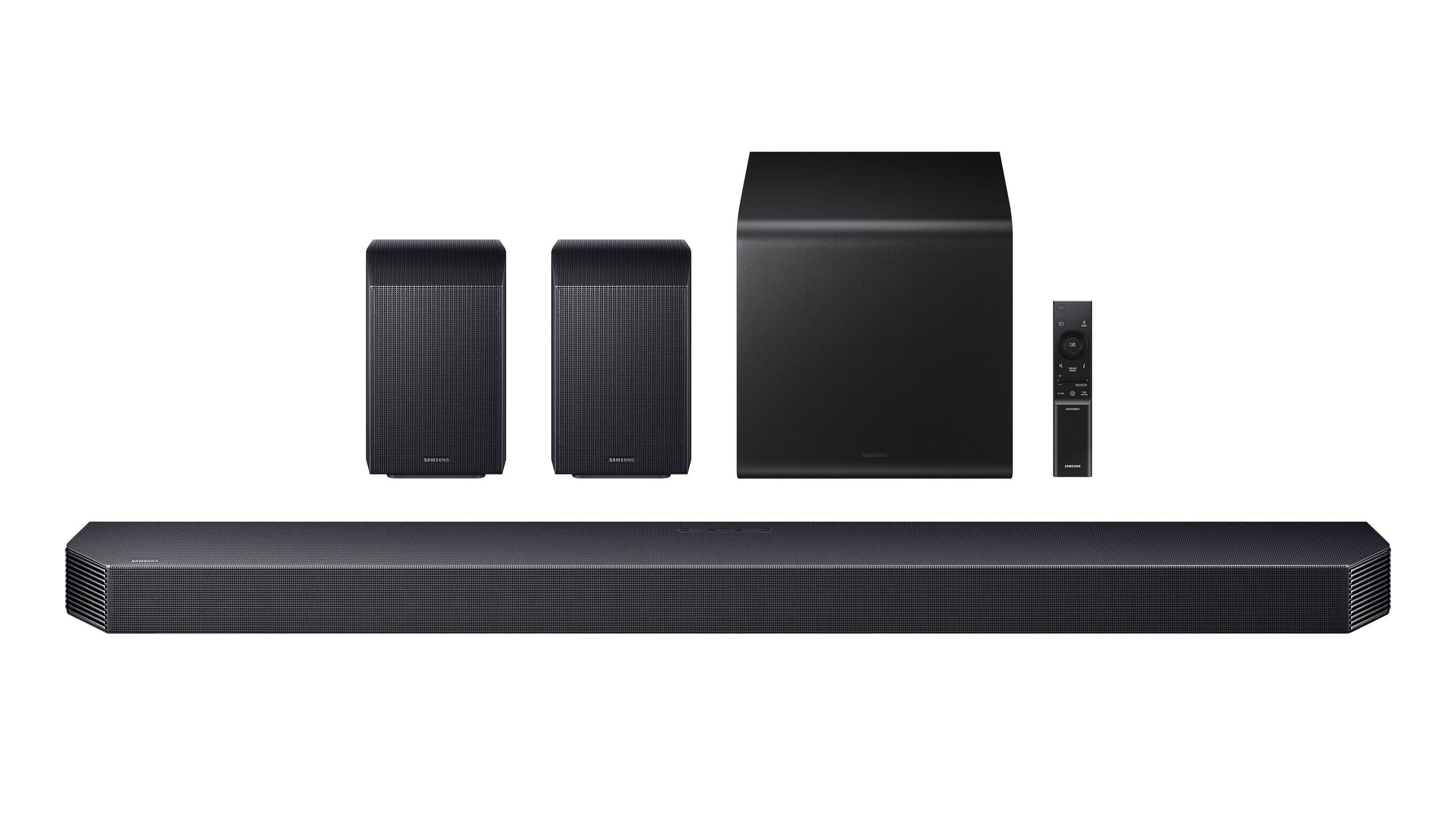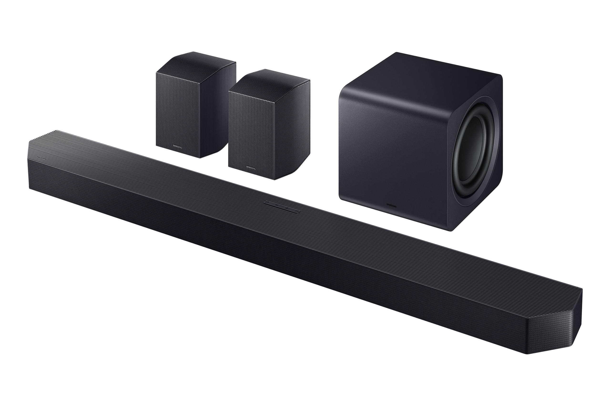 The Q990H remains the big home theater play. It is designed for people who want the most immersive option short of moving to a full AVR-and-speaker package. Samsung is pitching it as a true surround system with 11.1.4 channels, rear speakers, and a compact dual active subwoofer. It supports Dolby Atmos, DTS:X, and Eclipsa Audio.