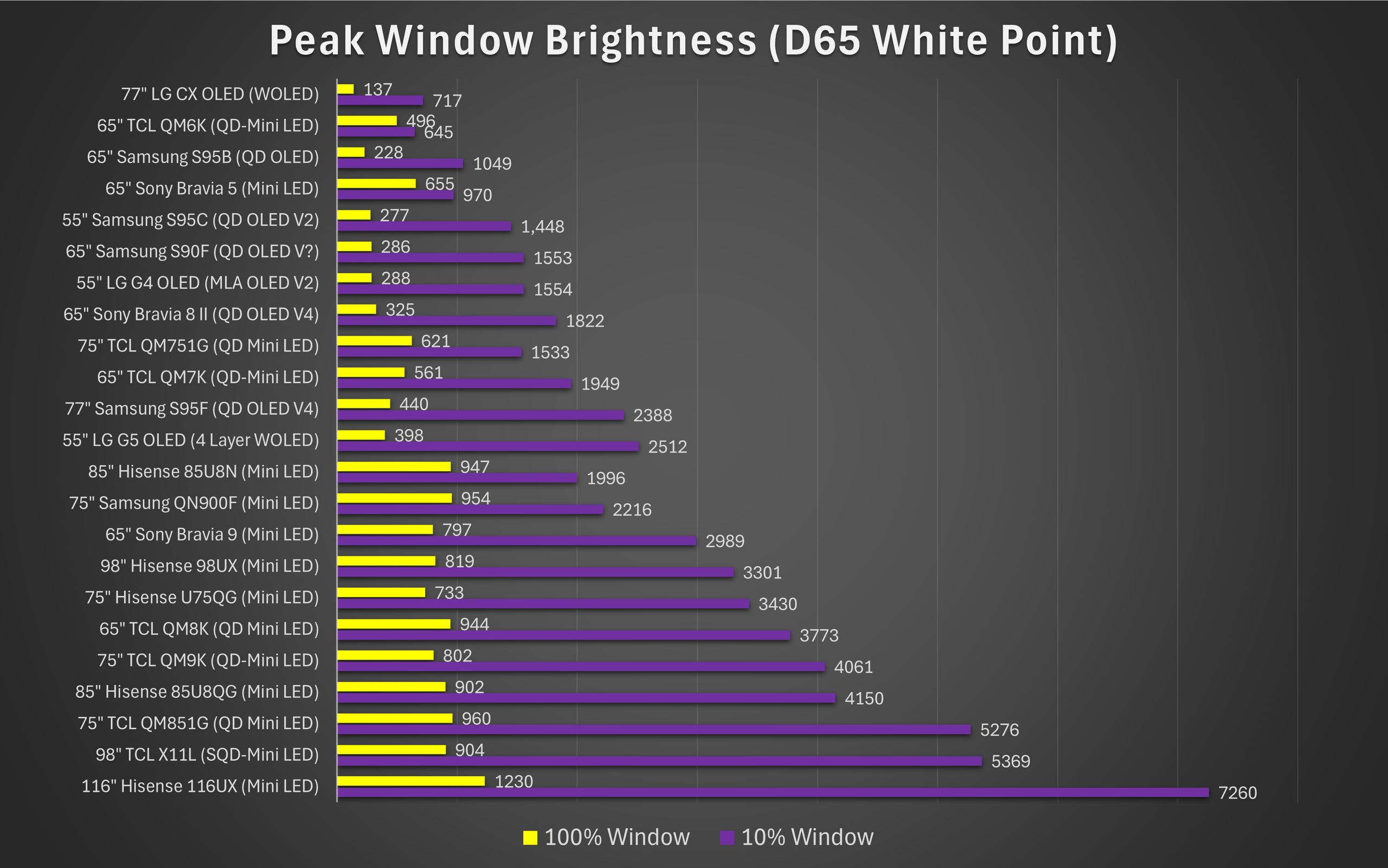 TCL advertises peak brightness approaching 10,000 nits, and while real-world performance doesn’t fully reach that figure in accurate picture modes, the measured results are still extraordinary and place the X11L among the brightest displays I’ve ever tested.