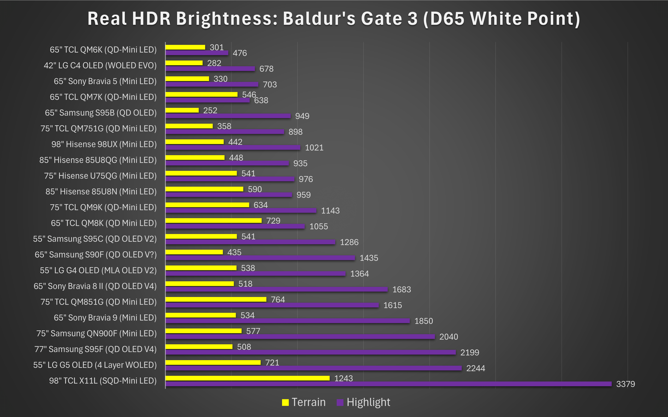 In real HDR gameplay from Baldur’s Gate 3, the X11L reached 3,379 nits on highlight details and 1,243 nits on terrain brightness, making it the brightest display I’ve measured in this real-world HDR test.
