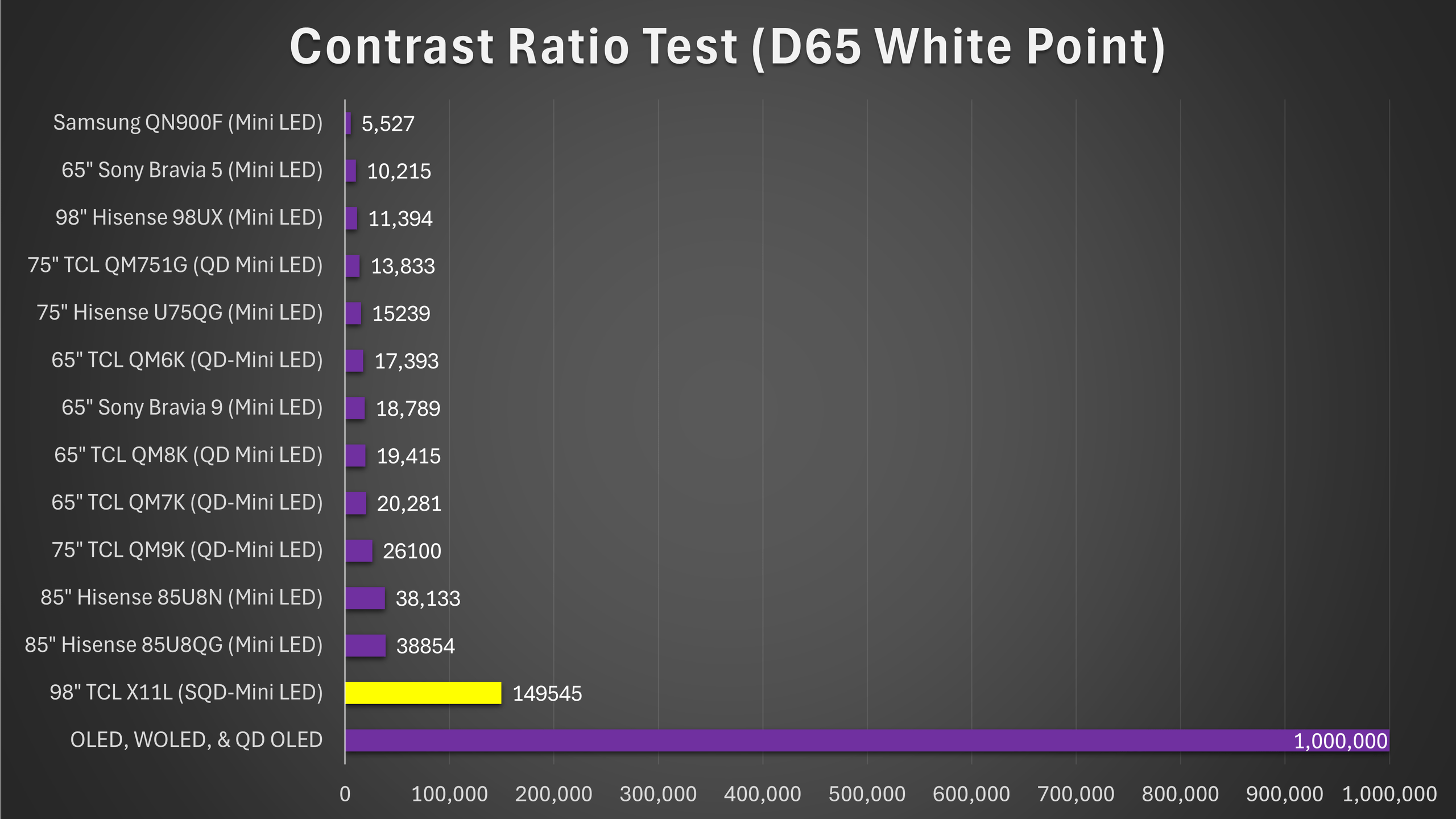 In a 10% window contrast test, the TCL X11L measured an astonishing 149,545:1, nearly four times higher than the second-best Mini-LED I’ve ever measured, which came in at just under 39,000:1.