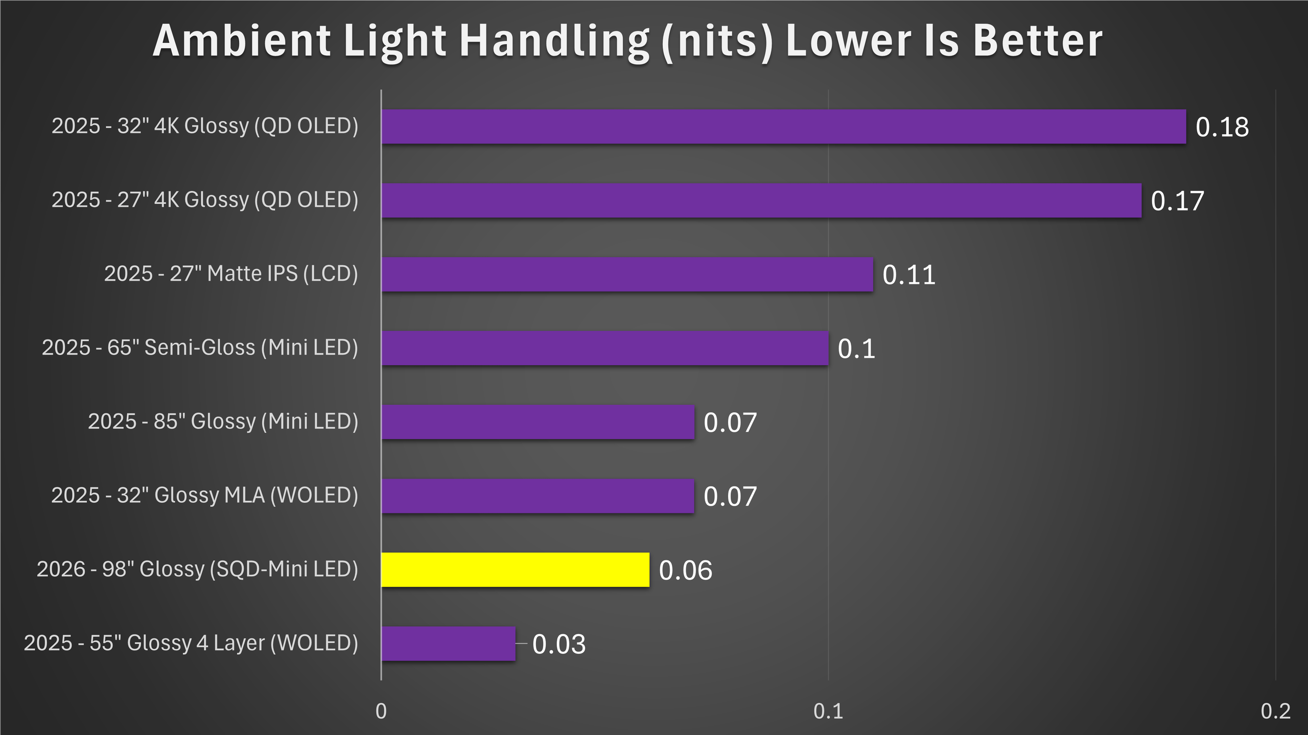Ambient light handling is equally impressive. Thanks to the glossy finish and careful panel design, I measured reflected light at approximately 0.06 nits, placing it among the better-performing TVs in bright rooms.
