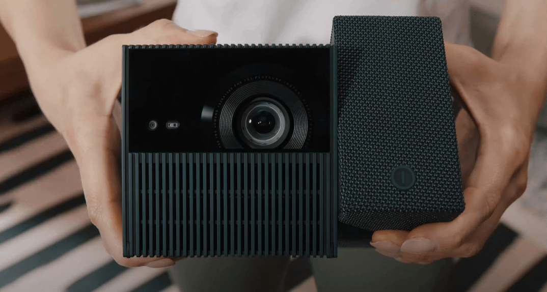 Instead of a standard box with a fixed lens, the PlayCube is made of two connected blocks. One contains the projection hardware, the other the speaker, and they’re attached by a hinge that lets you rotate them up to 90 degrees. That means you can easily point the image at a wall, screen, or even the ceiling, without dragging out a tripod or stand.