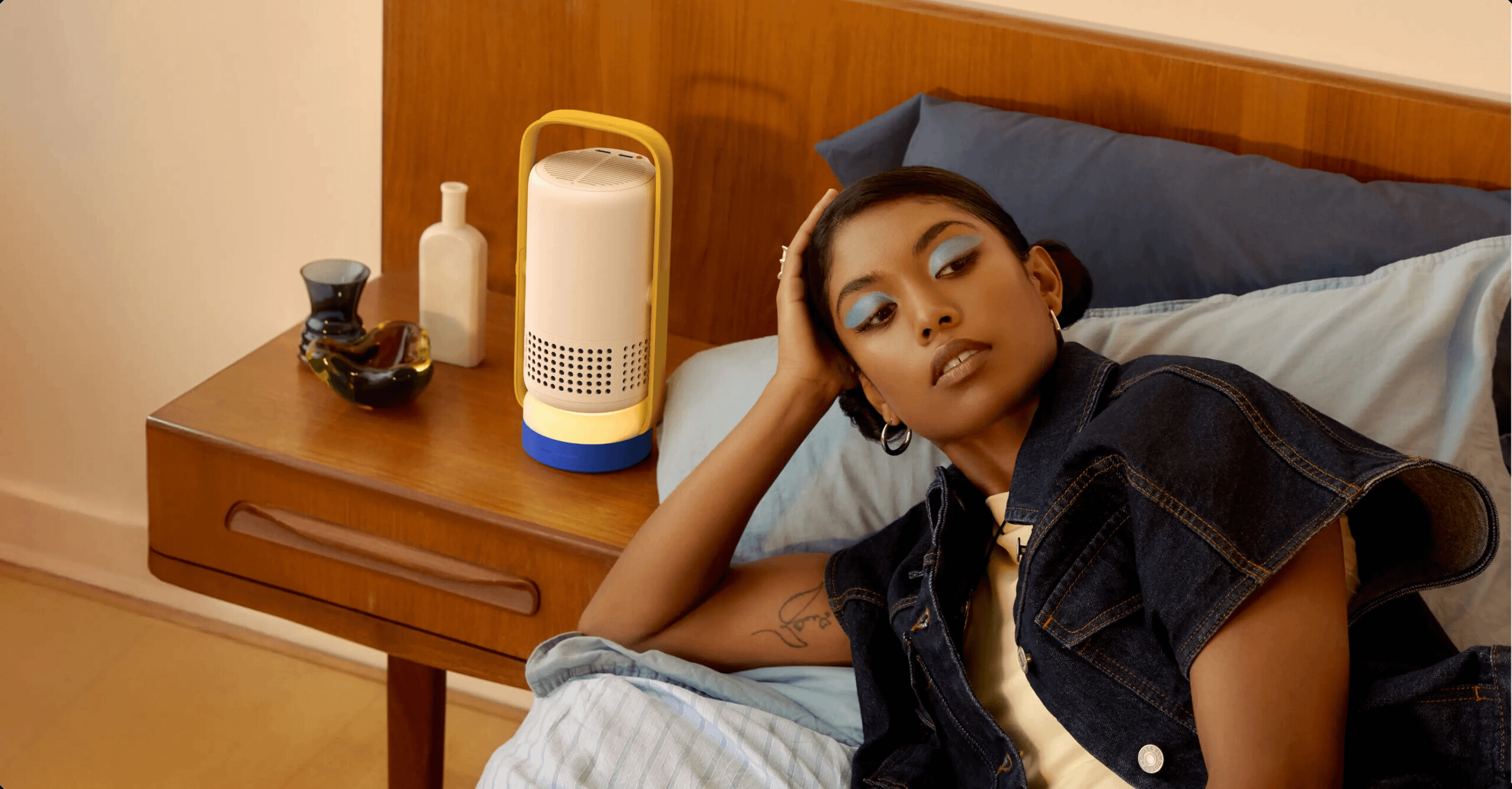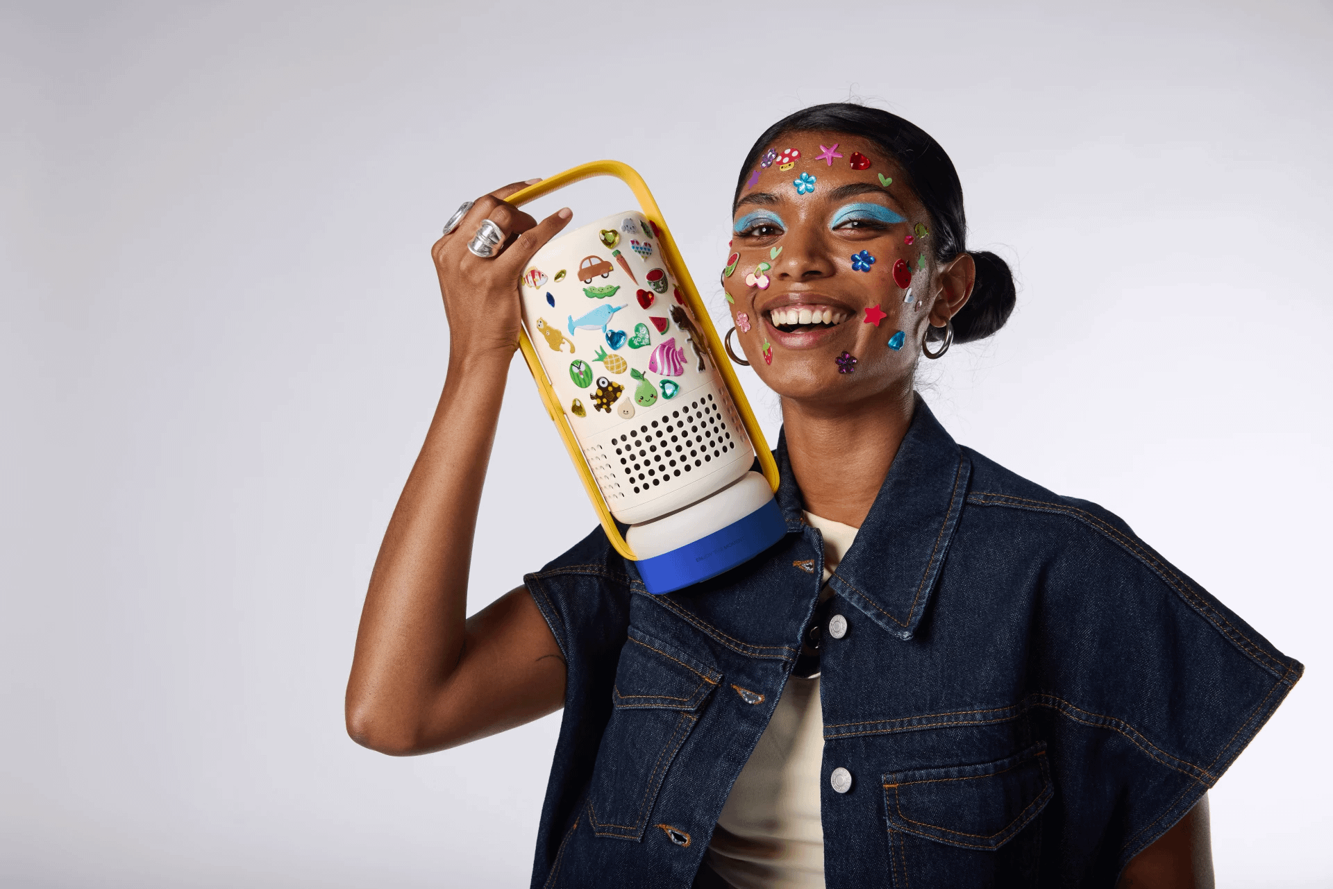 The Vibe One isn’t just about projecting video—it’s also built to look good sitting around when it’s not in use. It comes in two color options: a soft Cloud Ash and a playful Blue Spark with a yellow handle and blue base.