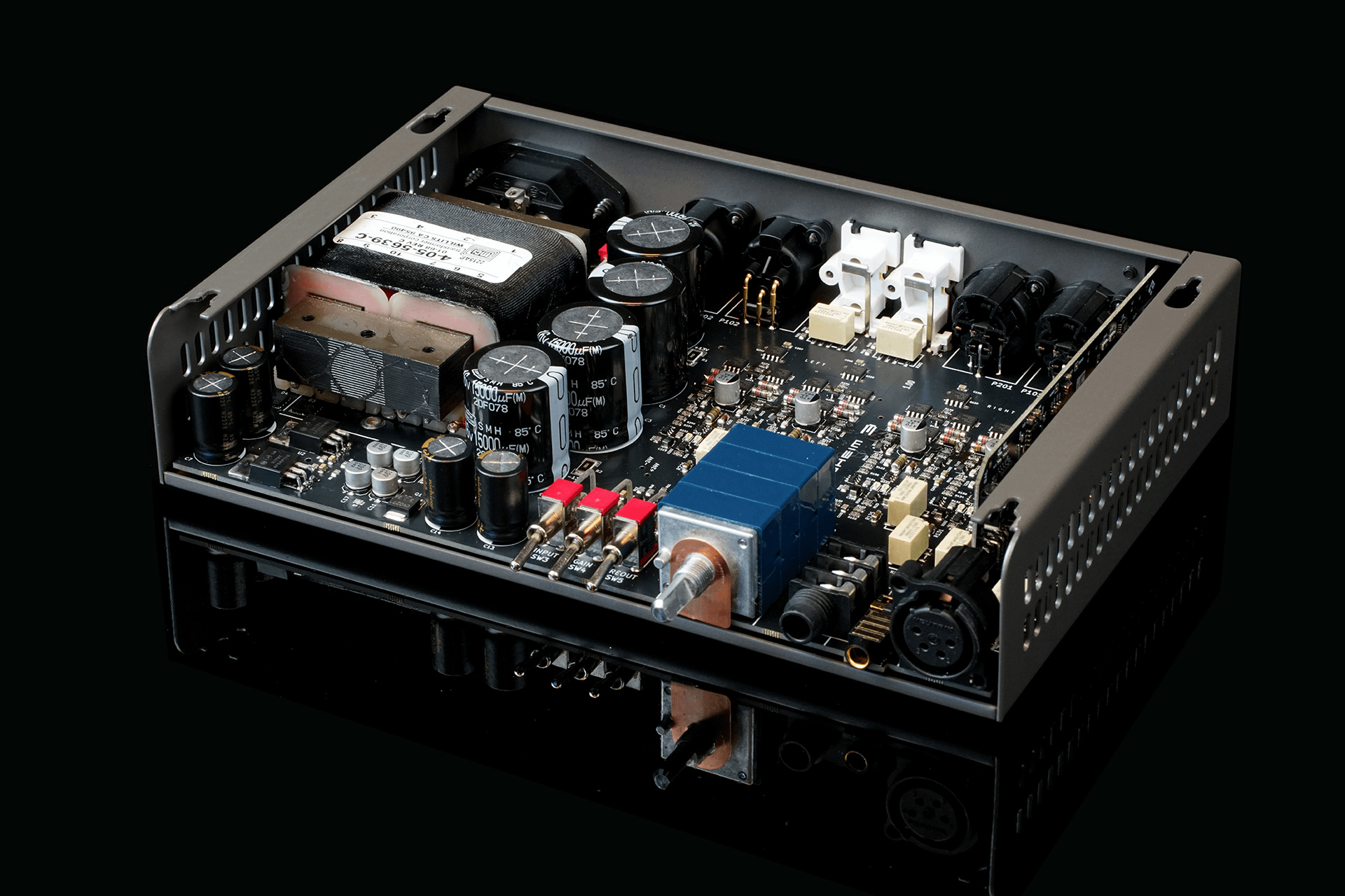 On the rear panel, you’ll find both RCA and XLR inputs, plus balanced and single-ended preamp outputs. A switch on the front lets you choose whether the amp sends signal to your headphones, your speakers, or both. These kinds of options make it easier to build a flexible, desktop-friendly audio setup without constantly plugging and unplugging cables.