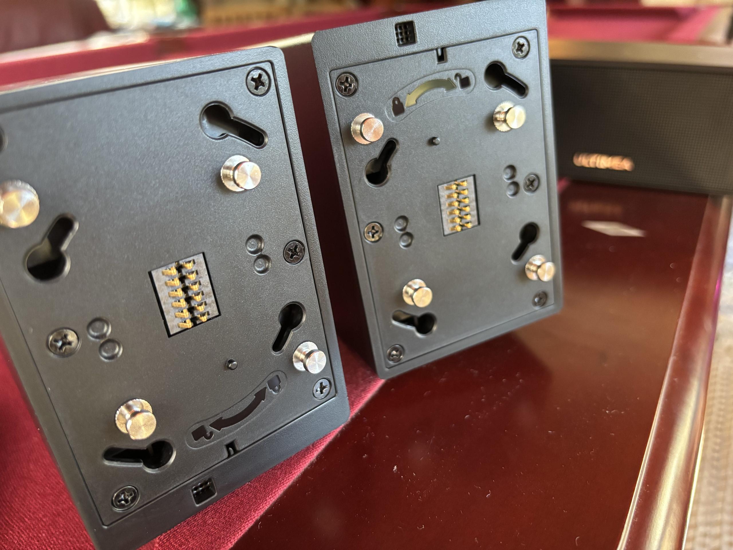 The surrounds are compact enough to blend into a living room, but they’re not afterthoughts. Each has a forward-firing driver and its own upfiring Atmos speaker. The gold accent rings give them a bit of style, and they’re clearly labeled left and right, which makes setup less of a guessing game.