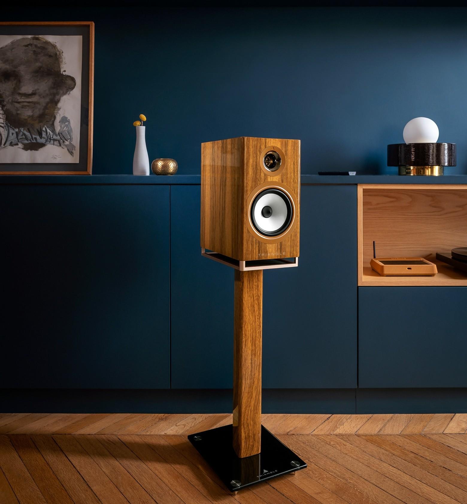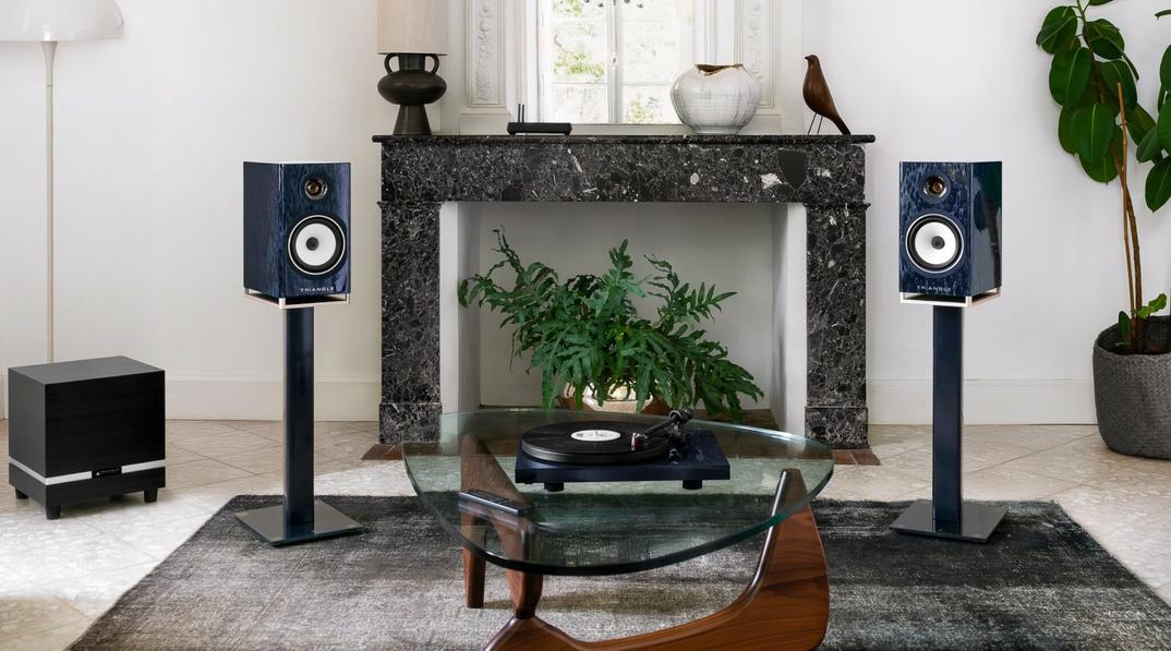 The speaker cabinets include Triangle’s DVAS (Driver Vibration Absorption System), which uses internal bracing and damping to keep cabinet resonance in check. The design includes curved edges, downfiring bass ports, and an elevated aluminum base—not just for looks, but also to improve airflow and help with placement flexibility.