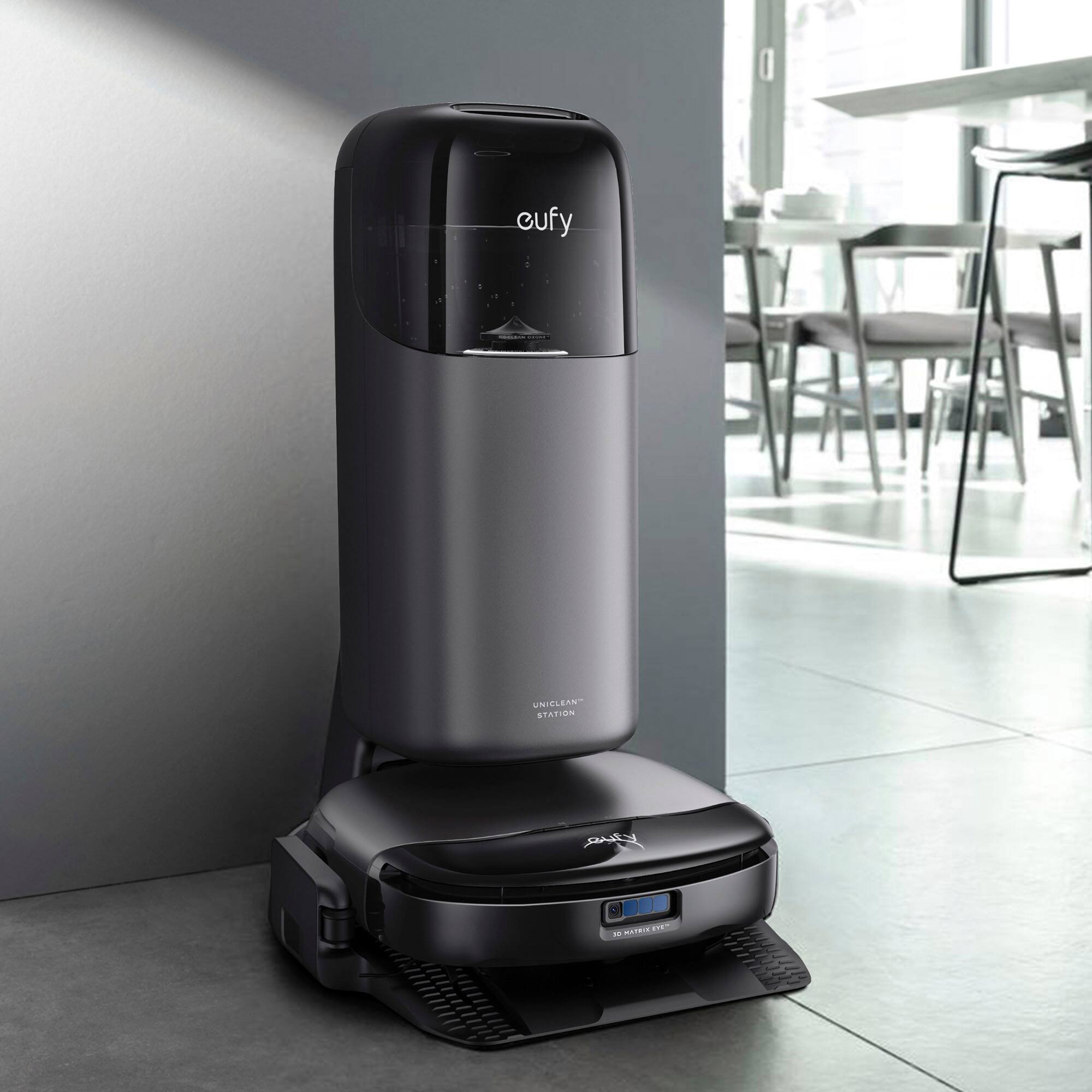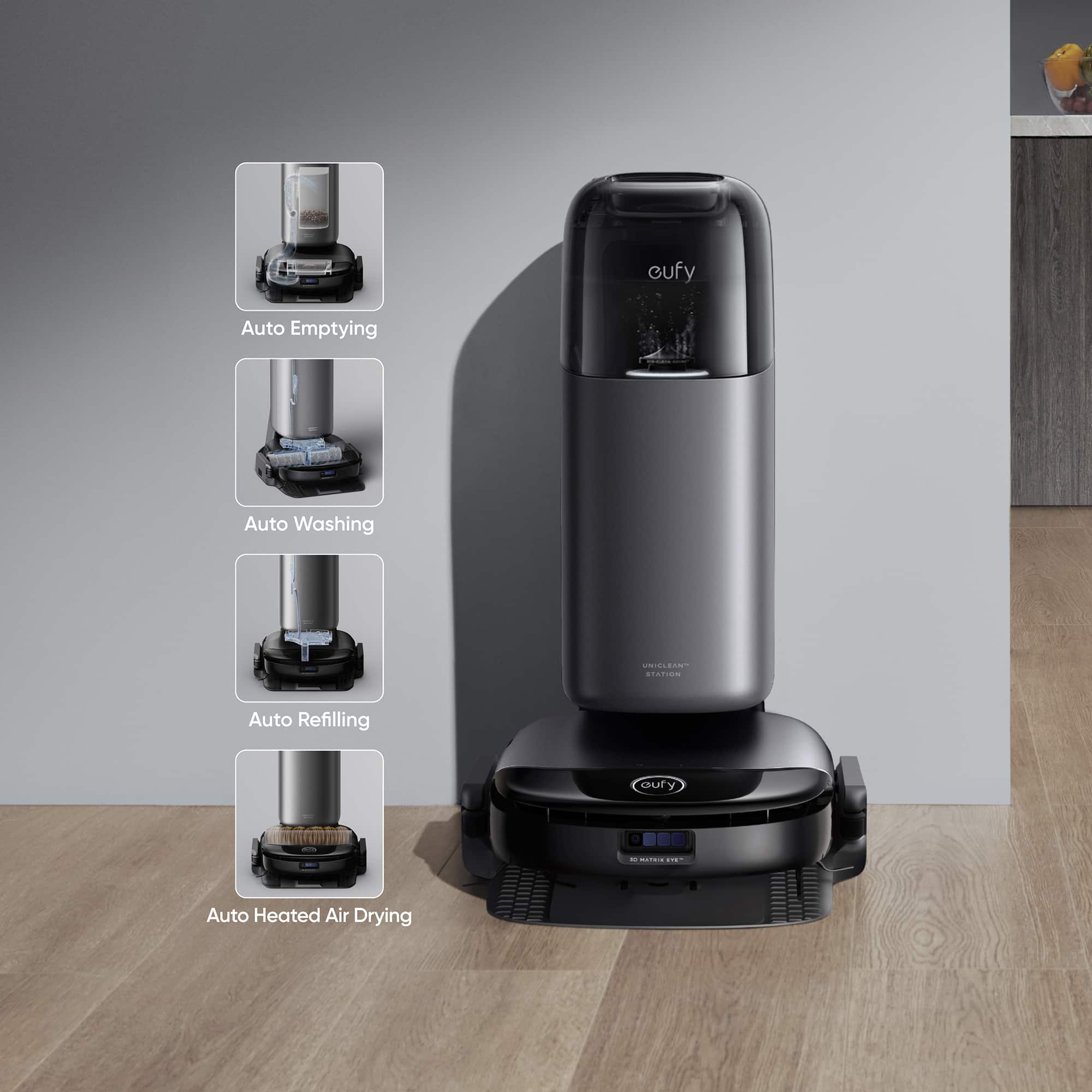 The Eufy S1 Pro Omni takes automation to an almost absurd level with its UniClean station. When the robot docks, the station automatically empties the dustbin, washes the mop roller with hot water, dries it with heated air, refills the clean water tank with the proper detergent mixture, and charges the battery. It even has an LCD touchscreen for manual controls.