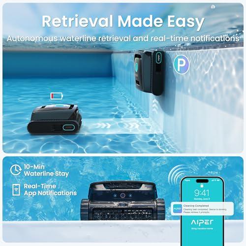 When the cleaning cycle completes, the cleaner automatically climbs to the waterline and sends push notifications through the app. This waterline parking eliminates the guesswork of retrieval timing and prevents the cleaner from sinking to the bottom where retrieval becomes more difficult.