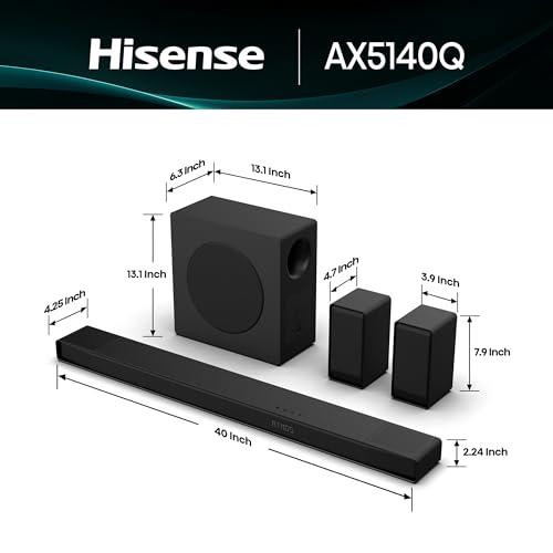 The Hisense AX5140Q, released in 2024, represents an aggressive value play in this space. It packs a 5.1.4 channel configuration, meaning five main speakers (left, right, center, and two surrounds), one subwoofer for bass, and four dedicated height speakers for Dolby Atmos effects. That's more height channels than many systems costing significantly more.