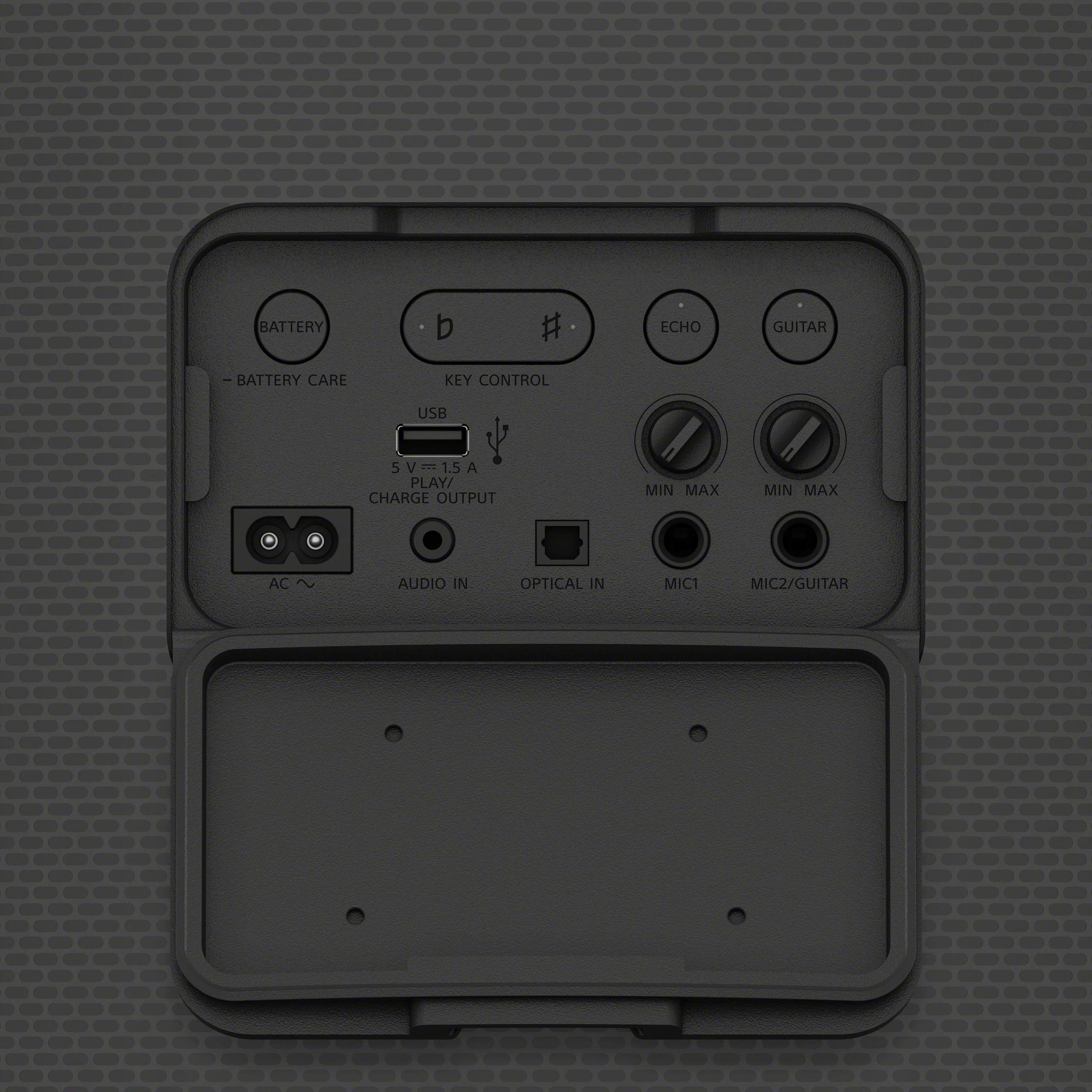 The Sony SRS-XV800 includes a unique optical digital input alongside standard connectivity options. This optical input enables direct connection to TVs, gaming consoles, and other digital audio sources, expanding the speaker's utility into home theater applications. The TV Sound Booster feature specifically enhances dialogue and adds bass to television audio.
