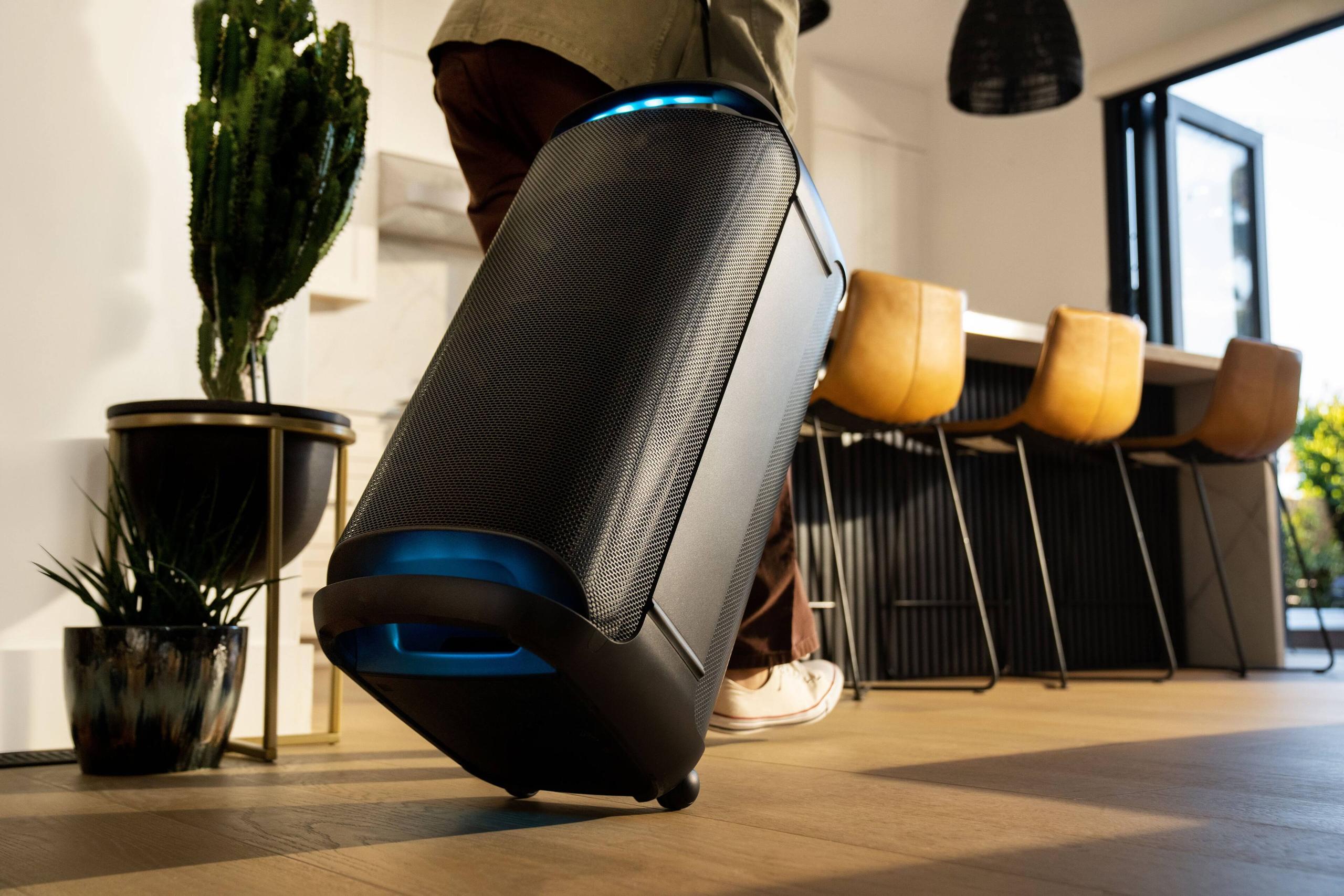 The Sony includes wheels and handles but lacks the telescopic handle feature. Its taller, narrower profile can make it feel less stable during transport, though it's still manageable for most users. The speaker includes an interesting feature where internal sensors detect whether it's positioned vertically or horizontally and automatically optimizes the sound accordingly.