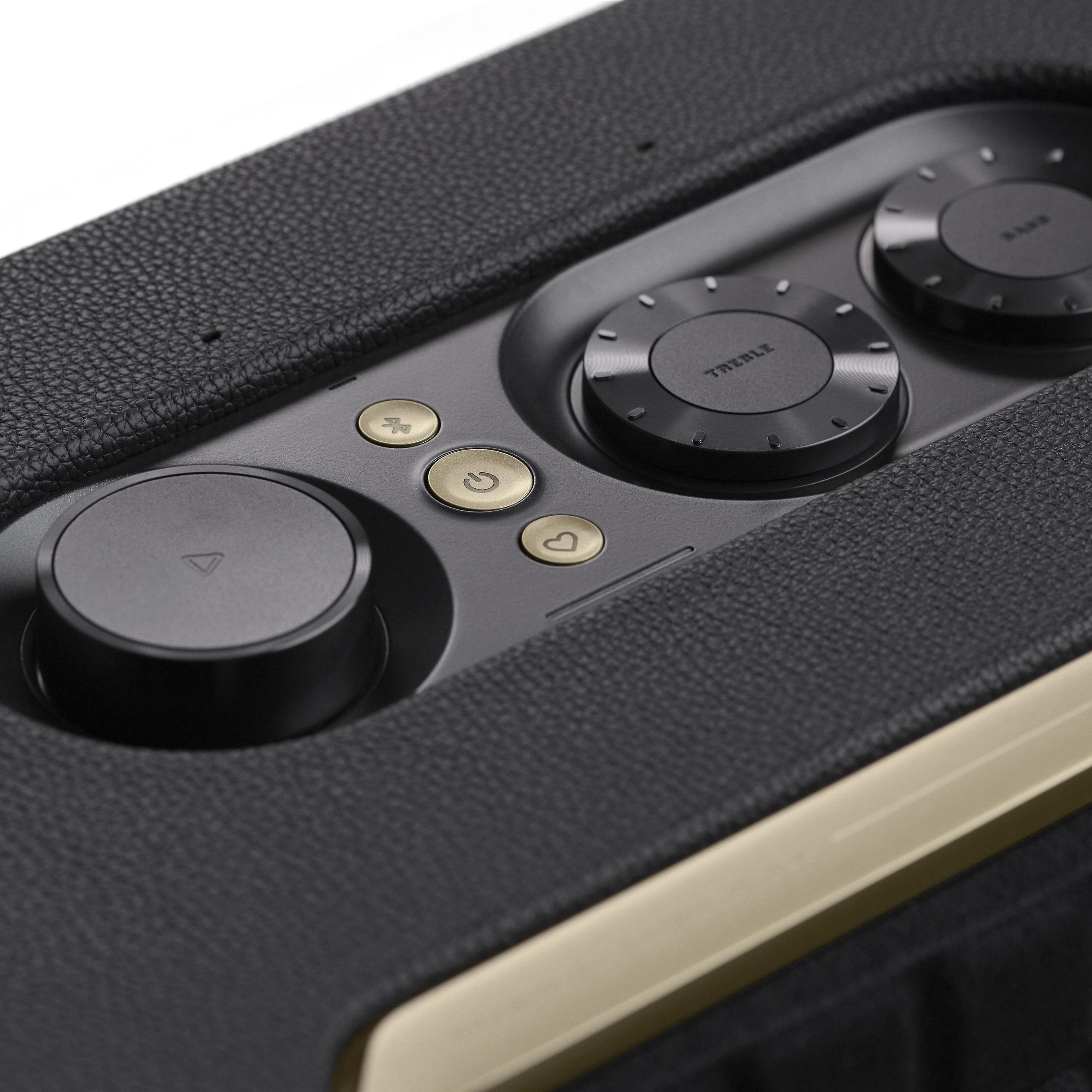 Marshall maintains their iconic amp-inspired aesthetic with textured vinyl covering, metal grille, and brass-colored control knobs. It's a timeless look that works in almost any decor. The build quality is exceptional, with solid materials and satisfying tactile controls.
