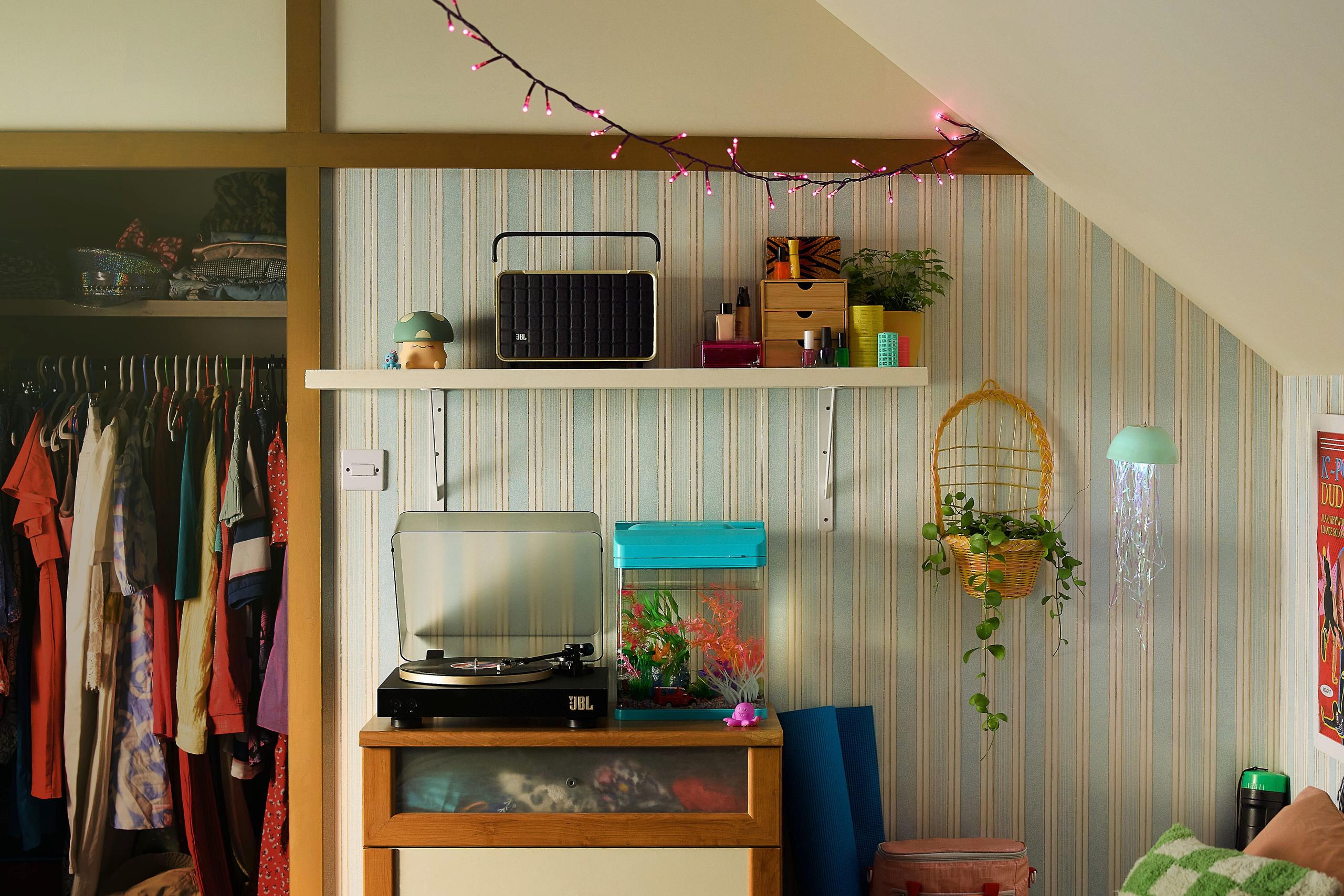JBL takes a retro-modern approach with their Quadrex grille pattern and aluminum handle. The speaker uses impressive sustainable materials - 100% recycled fabric and 85% recycled plastic. The addition of a handle and battery makes it more versatile for different uses around the home.