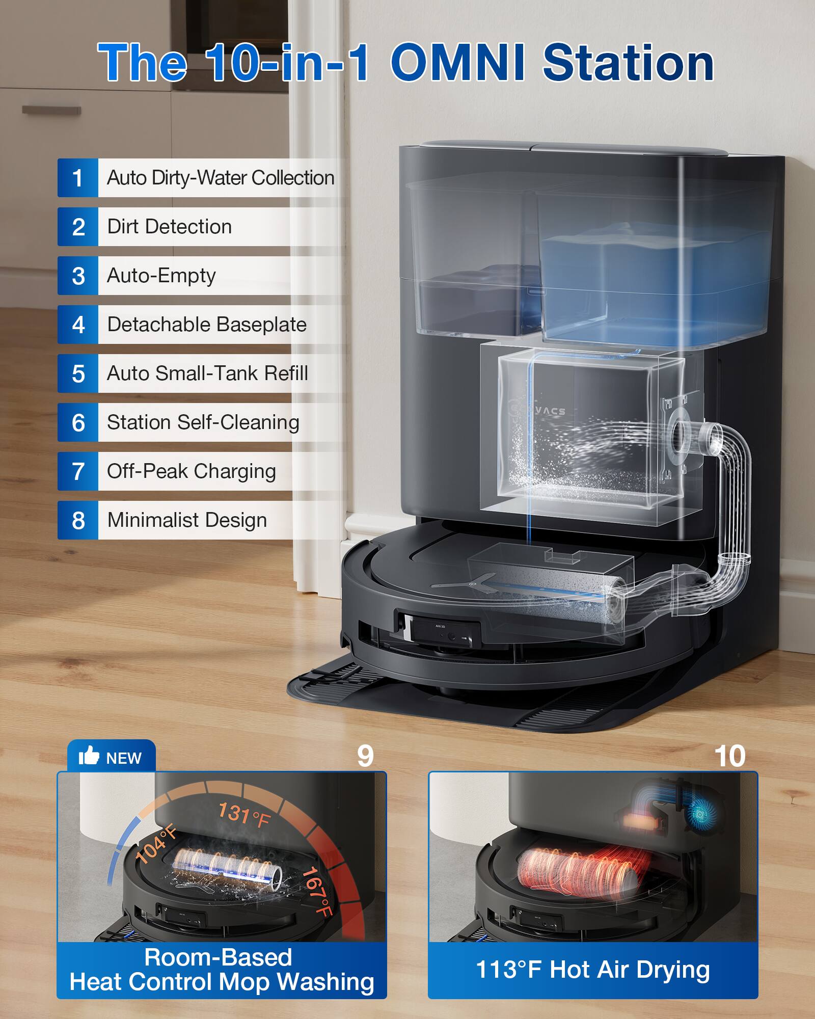 The Freo Z10 offers what might be the most comprehensive self-maintenance system available. Its base station washes the mop pads with hot water up to 167°F—hot enough to sanitize and remove oils and sticky residues that room-temperature water can't handle. It then uses warm air drying at 104°F to prevent mold and odors. The system can operate for up to 120 days without requiring user intervention, assuming normal household conditions.