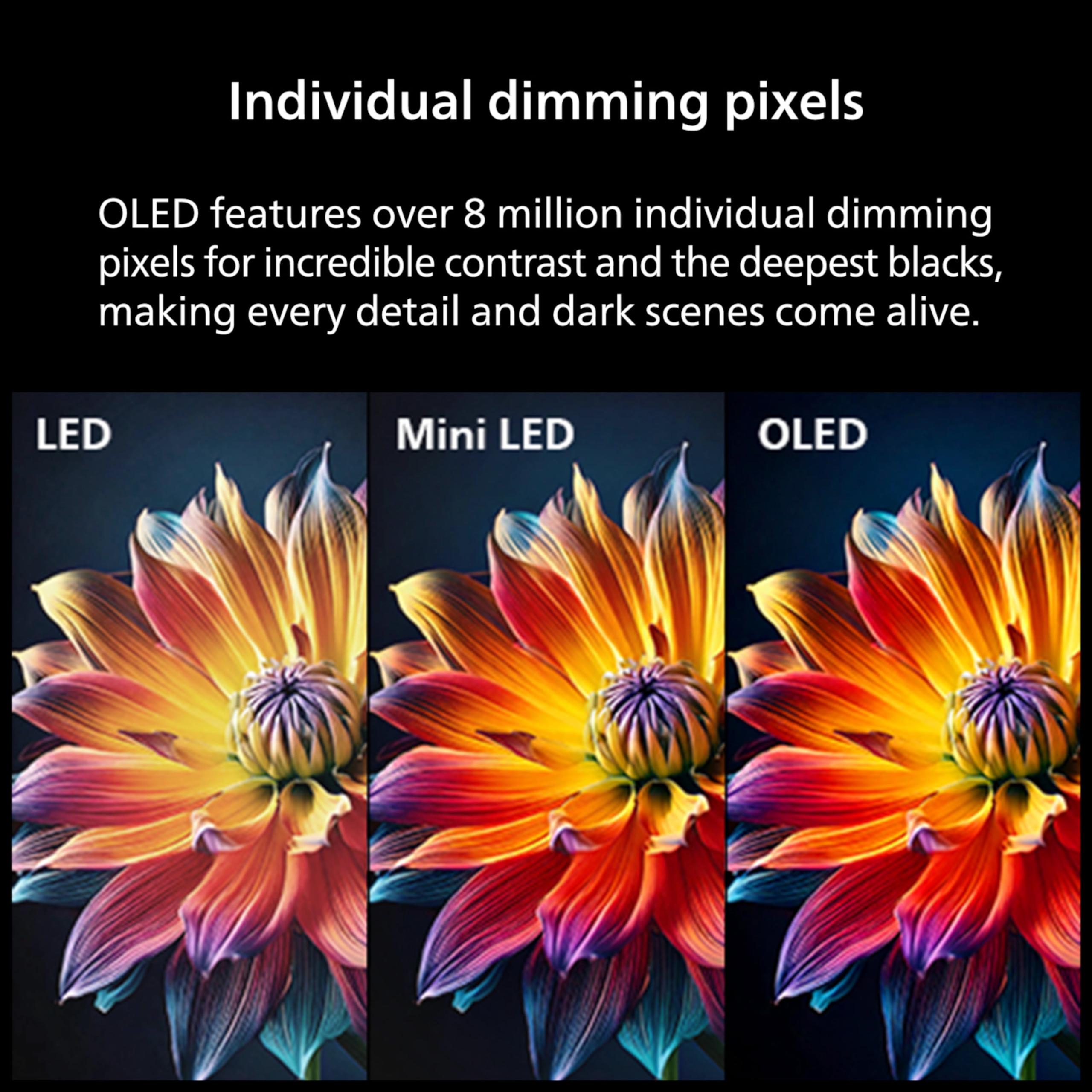 | OLED with 8 million self-illuminating pixels | QLED with quantum dot enhancement and LED backlight |