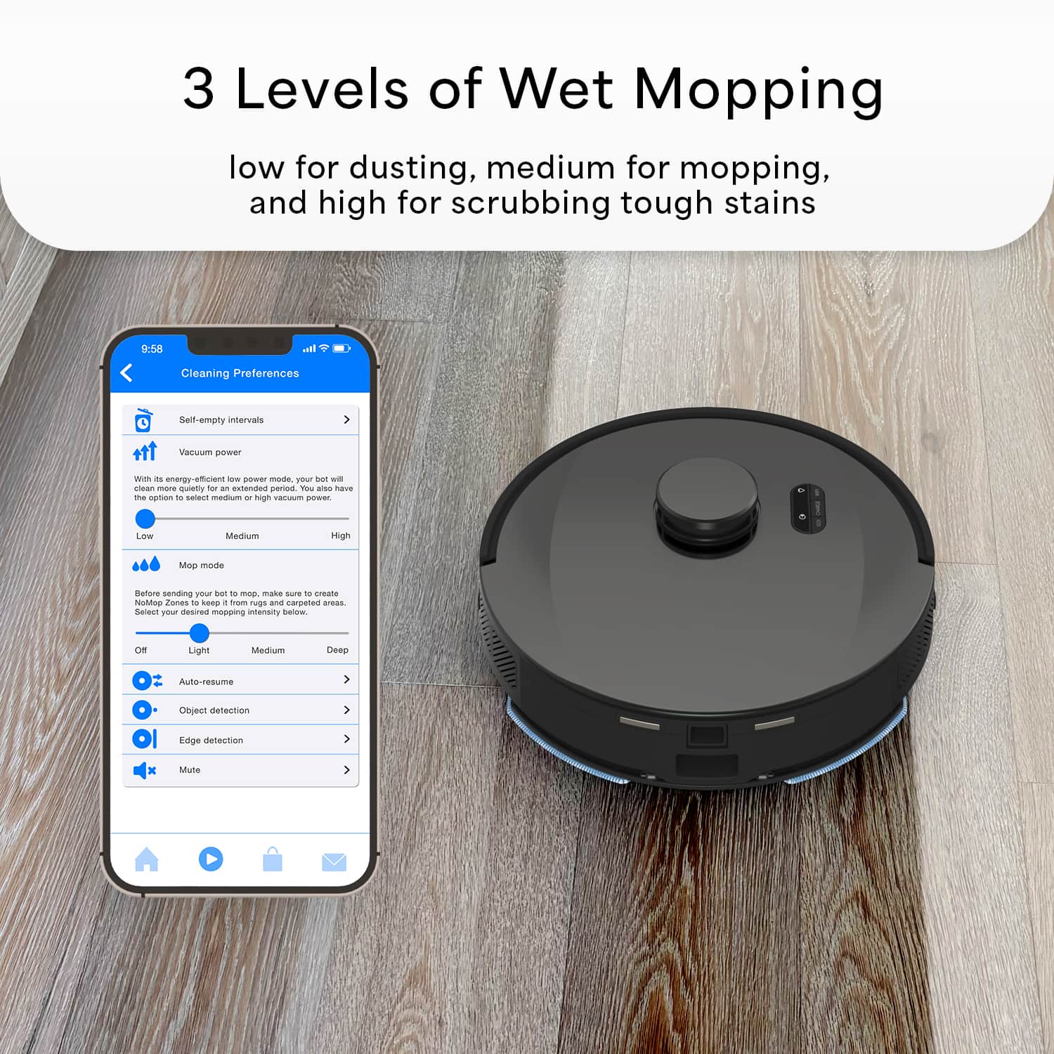 The bObsweep UltraVision takes a much simpler approach. It drags a dampened microfiber pad across hard floors—effective for daily dust and light debris but unable to tackle sticky spots or dried spills. You'll need to manually set up no-mop zones to protect carpets, and the small water tank requires frequent refilling during larger cleaning sessions.