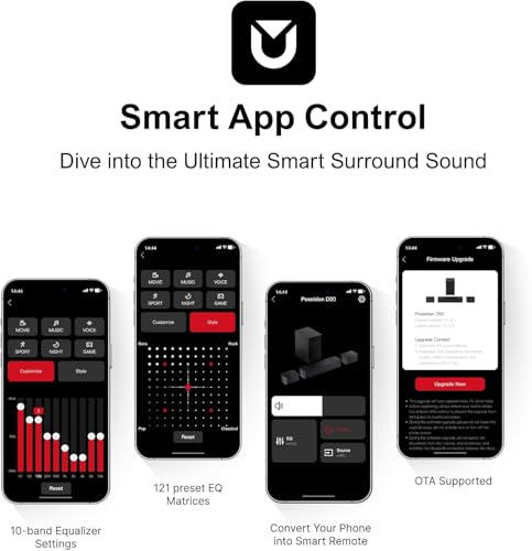 The Ultimea Poseidon D50 5.1 Soundbar includes comprehensive smartphone app control with 121 EQ presets and extensive customization options. The Yamaha SR-C30A offers a basic remote app but focuses more on physical remote and TV remote integration.