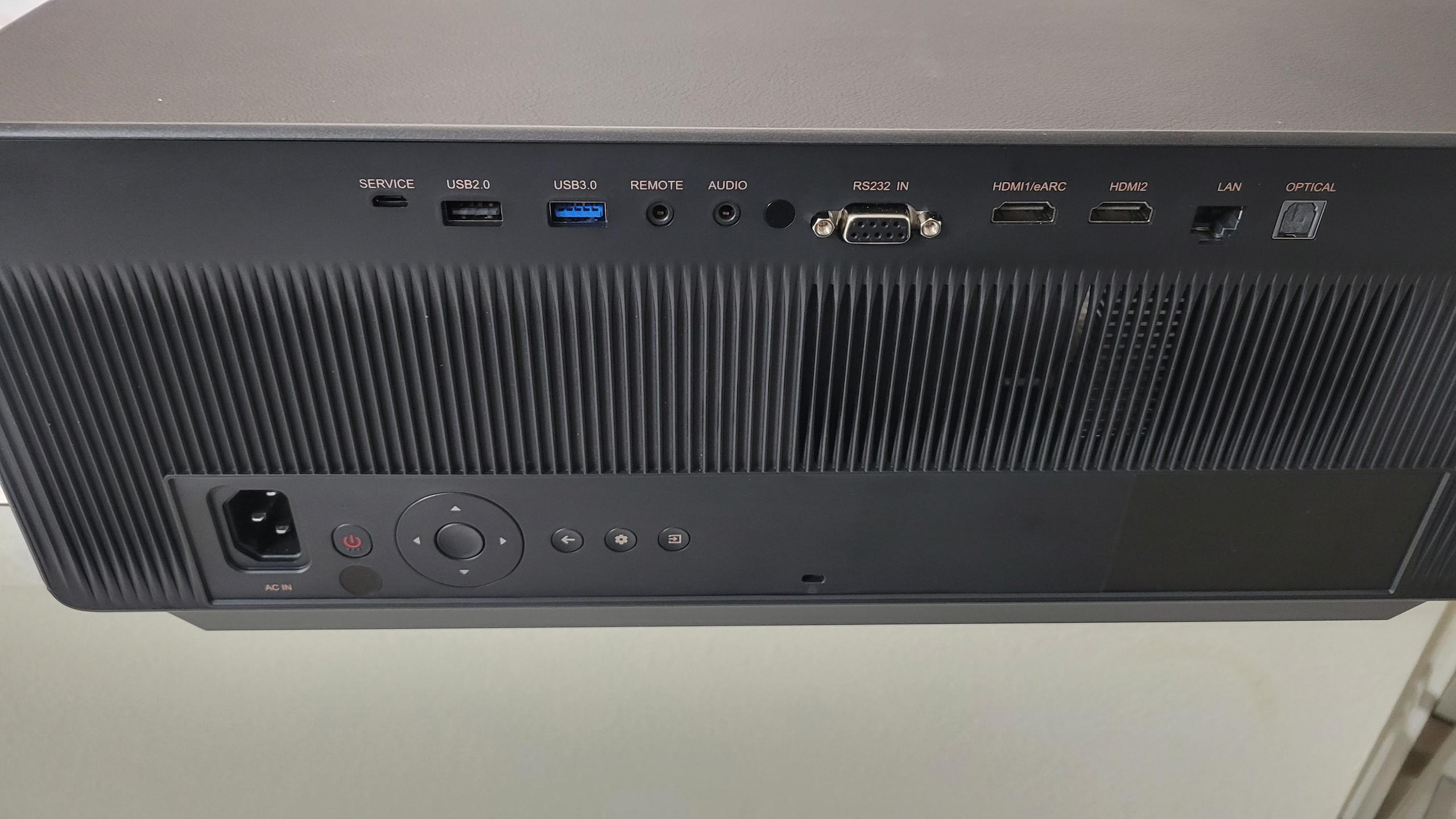 The recessed rear panel reads like a wishlist for both home theater enthusiasts and commercial integrators. Two HDMI inputs (HDMI 1 with eARC for lossless Dolby Atmos passthrough), USB 3.0 and 2.0 for media playback, optical Toslink and 3.5mm analog out for legacy audio, a hardwired RJ45 Ethernet jack, RS232 for home automation systems like Control4, Savant, and Crestron, and a 3.5mm wired remote input for IR extension if the unit is hidden away. It’s the kind of port selection that custom installers dream about.